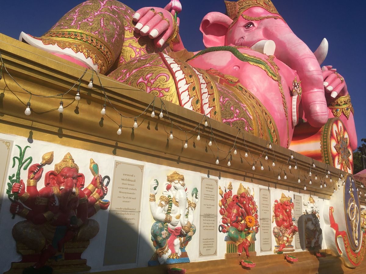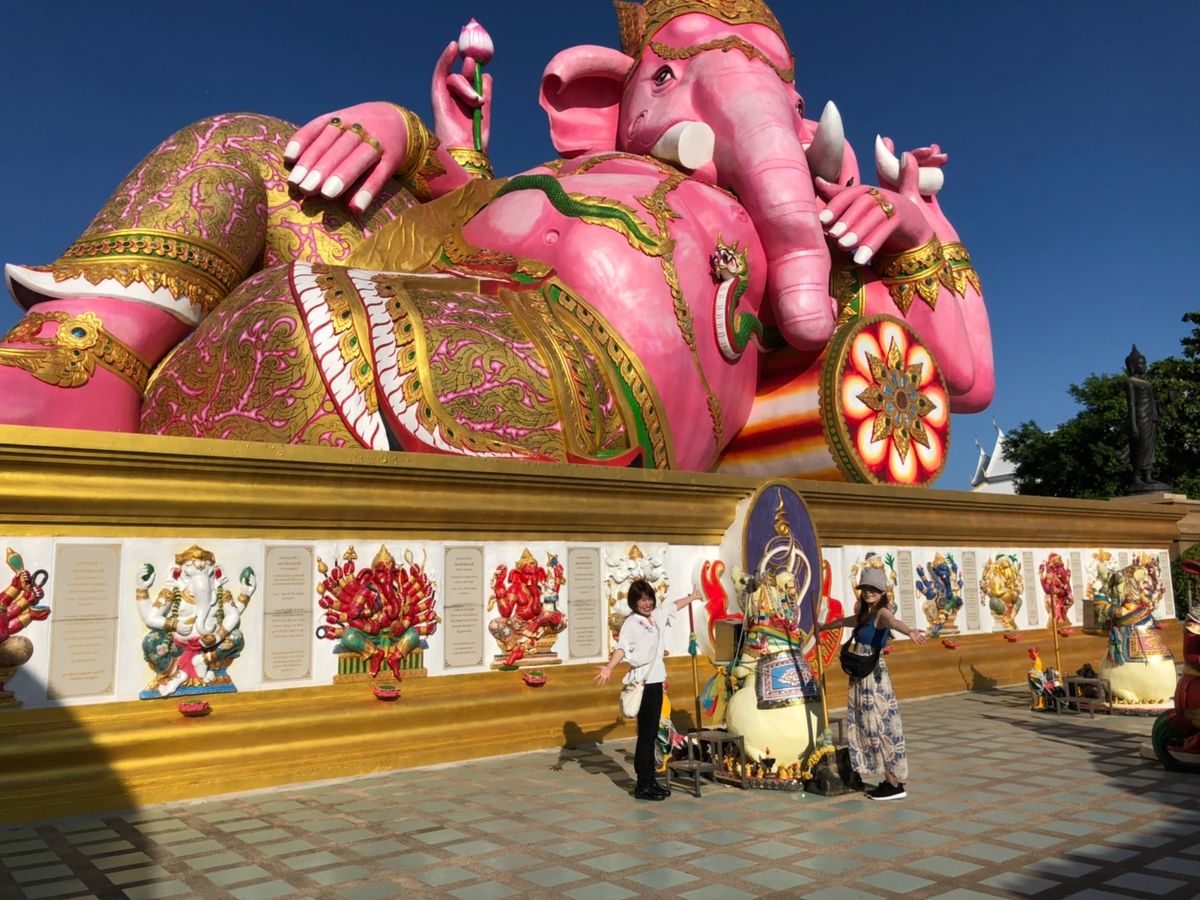 行き方を検索したけど、個人的に行くのが難しいようだったので、ベルトラさんのツアーに申し込みました。バンコクから車で片道1時間15分くらいで、念願のピンクのガネーシャが目の前に現れた時は、大きさに圧巻されました!周りにも見応えがあるものが多々あり、面白い場所でした。そのあとバンコクに戻り訪れたワットパムナムは、とても美しい場所で一見の価値あり!そこでガイドさんに買ってもらって食べたバナナとさつま芋の天ぷらはとても美味しかった!笑笑