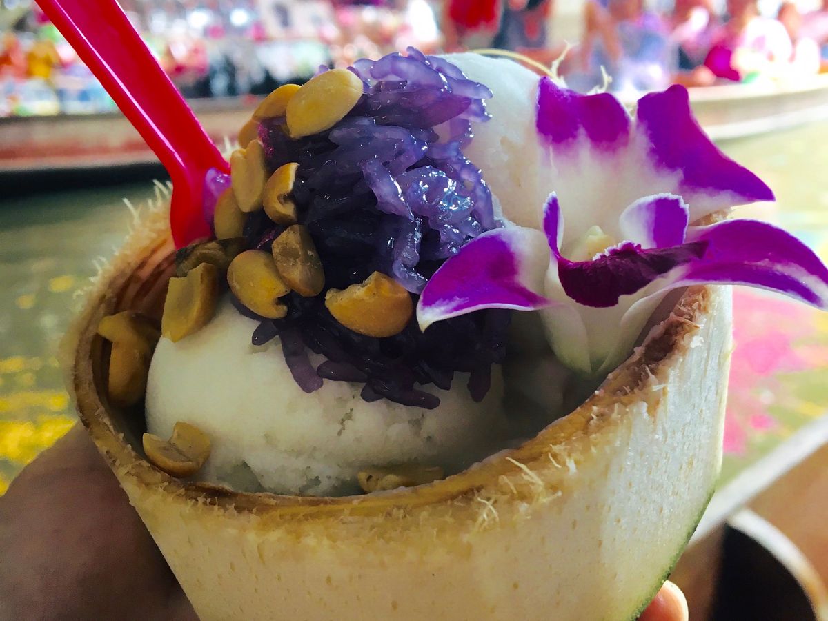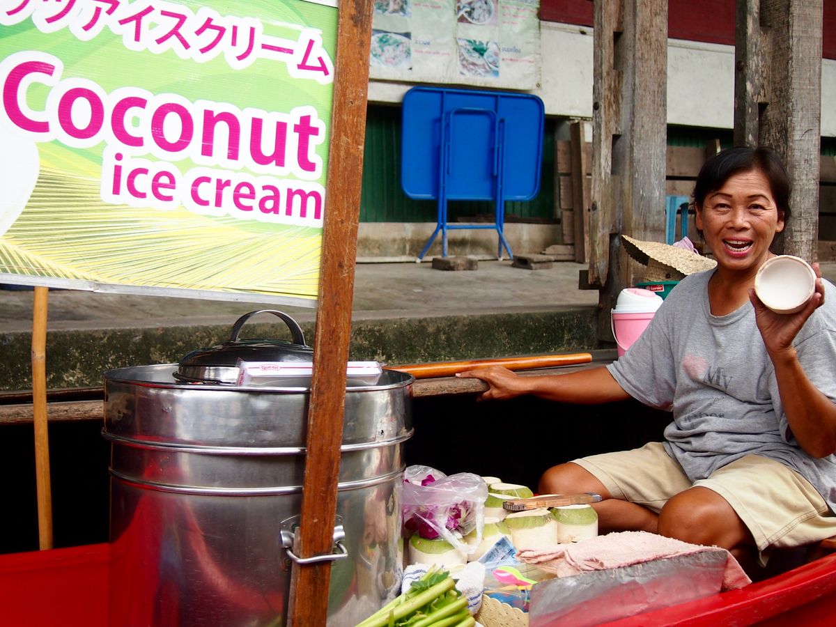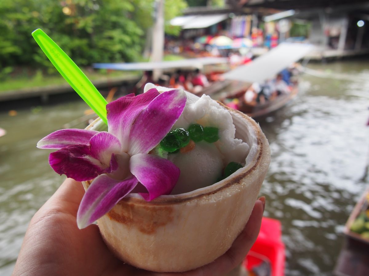 水上マーケットは殊更楽しいです。手漕ぎボートに乗ると、日本では決して味わえない雰囲気を体感できます!乗船前にガイドさんが商品の大体の値段を教えてくれました。私達はココナッツアイスを購入。見た目も可愛らしくて美味しいですよ。乗船時間は20分くらいでした。
