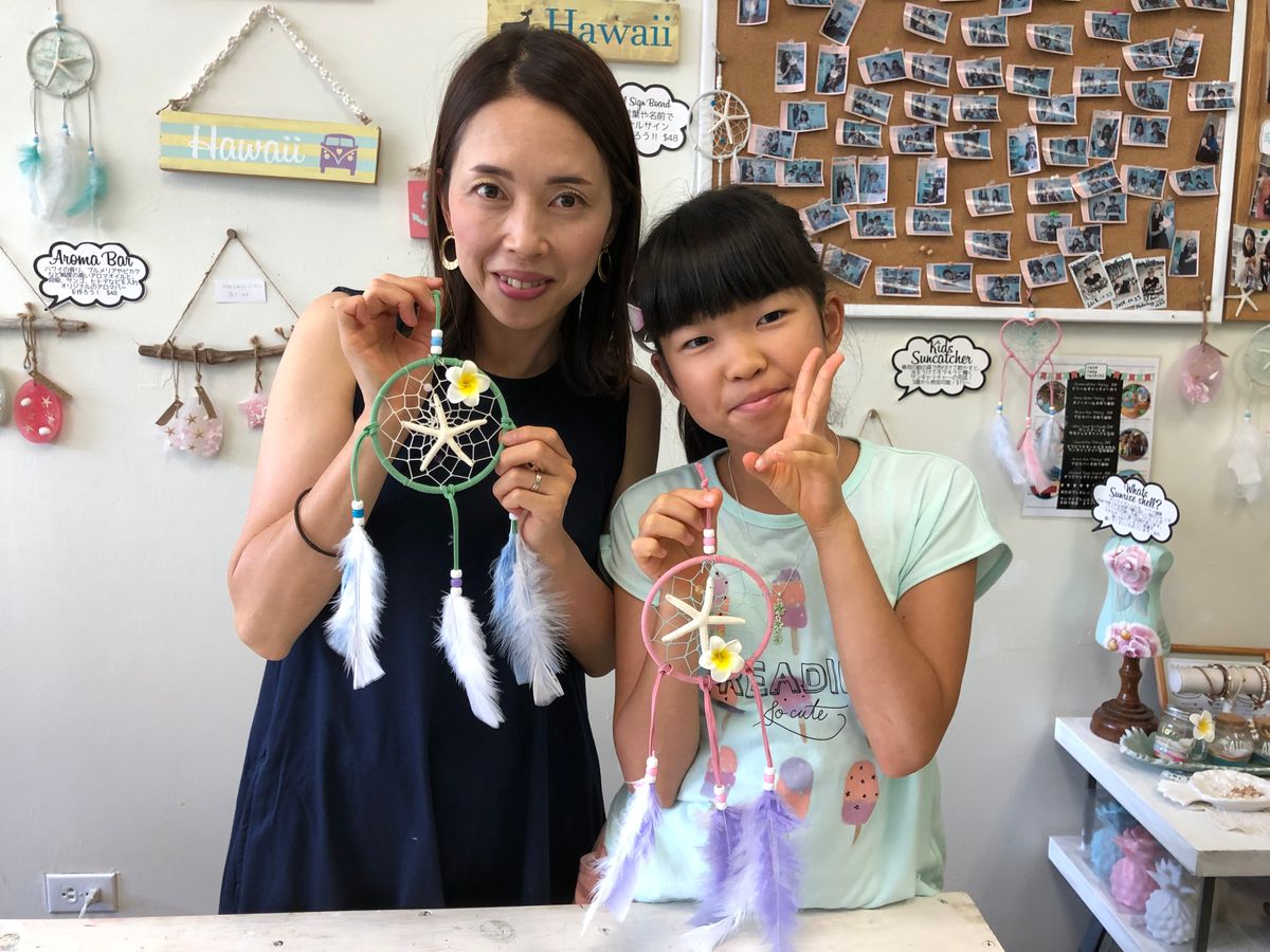 物作りが好きな小学4年生の娘と何かハワイ らしい体験がしたいと、親子で参加しました。場所はワイキキ中心でとても分かりやすいビル内の一室でした。初めての体験でしたが、順序良く分かりやすく教えてもらったので、網目の細かい方を選んだのですが、1時間ちょっとで完成しました。ひもの色、羽根、ビーズなど、材料は自分の好みの物を選べましたが、どれも色が綺麗で可愛い物が多くて良かったです!親子共々、とても素敵な作品が出来て、とても良い思い出となりました。早速帰国後、部屋に飾ってありますが、可愛いインテリアとなっています!