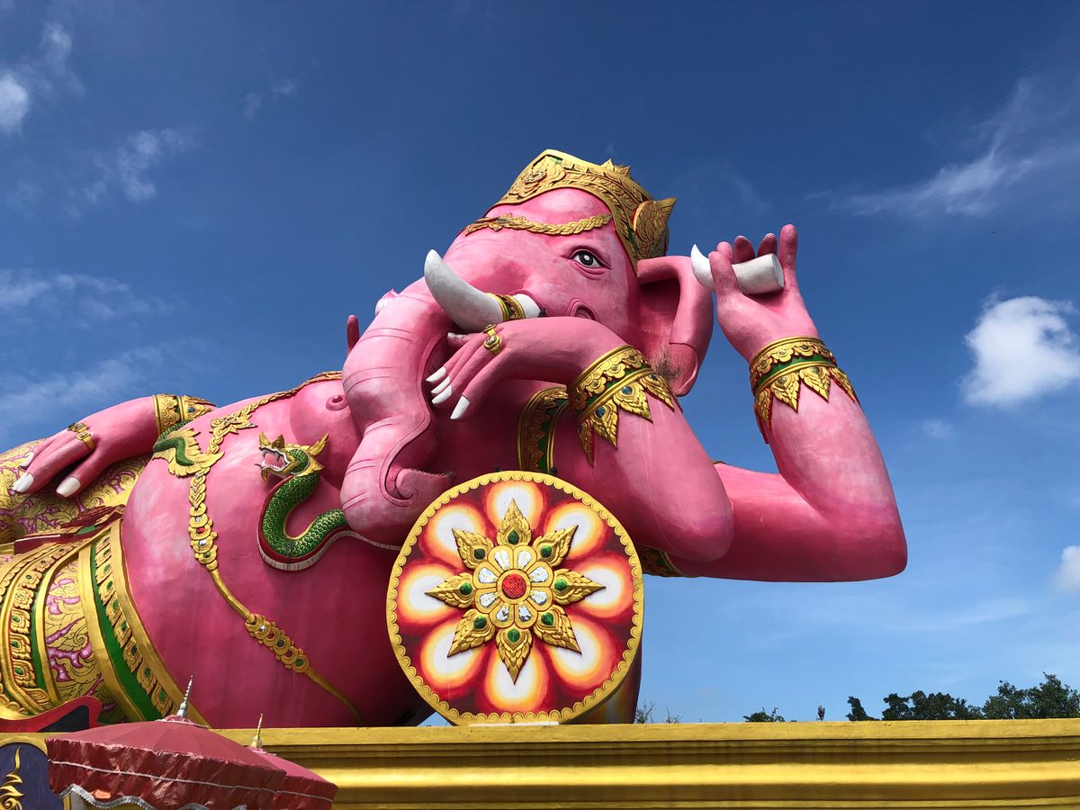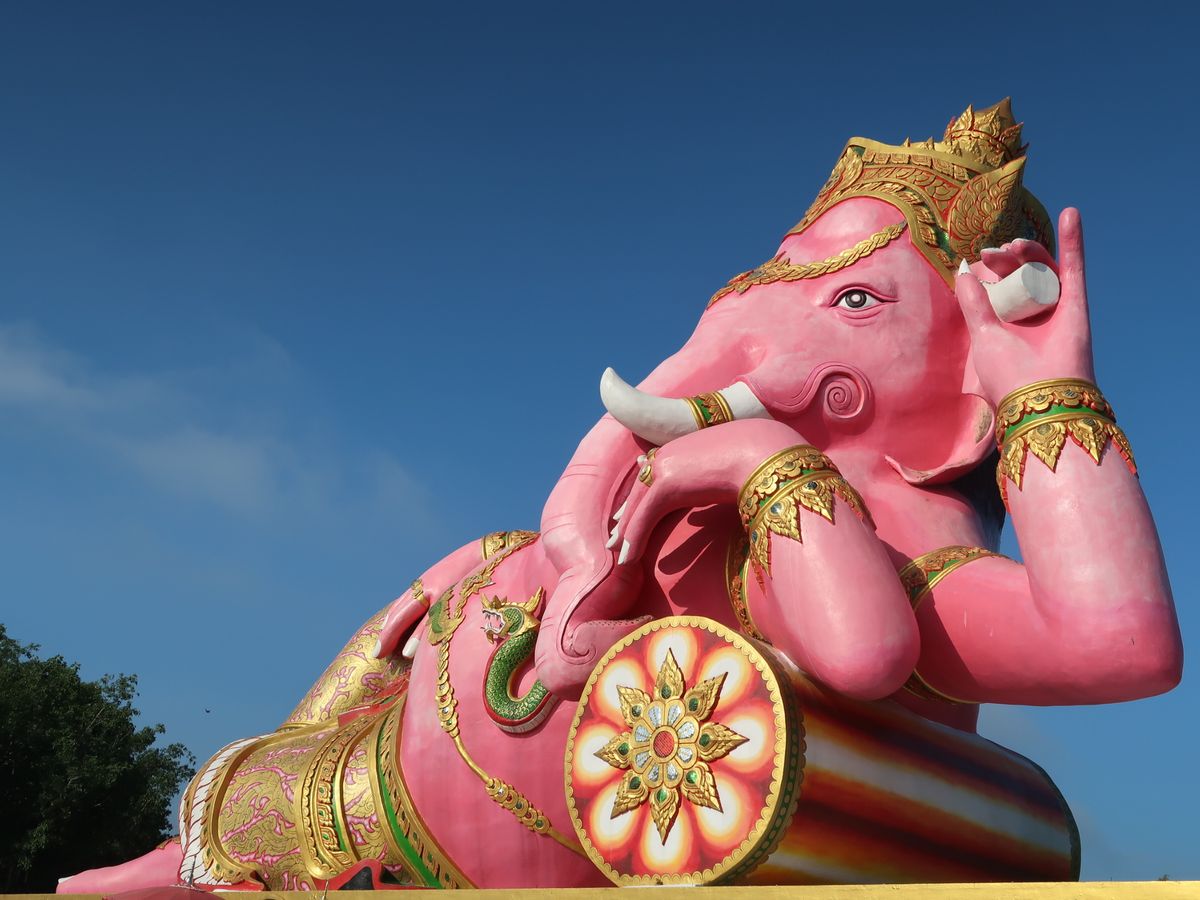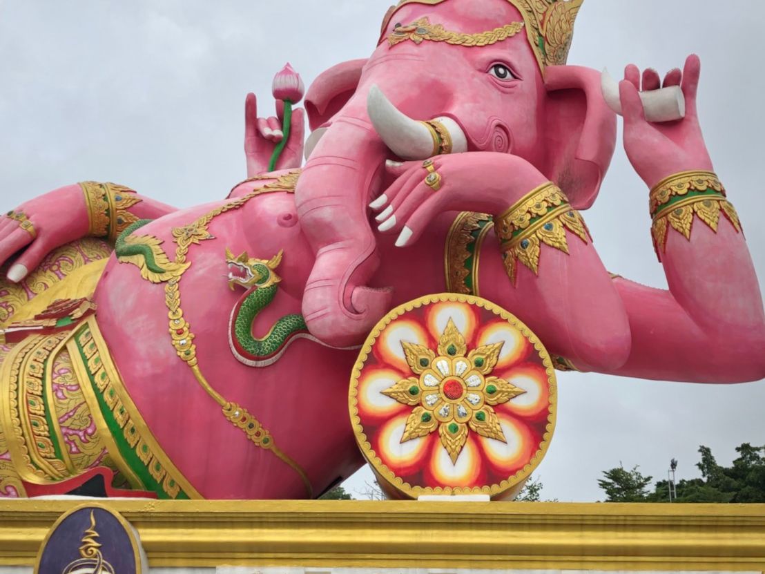 ようやく取れた休みに、タイミングよく手に入った航空券がバンコクでした。ここのところ忙しく過ごしていたため頭も身体もヘトヘトで、自分で現地の行動計画を立てる気力もわかないまま出発の日だけが近づいていました。勤め帰りにたまたま目にしたガイドブックの表紙にピンクのガネーシャ。あまりにも怪しすぎて、これはひとつ観ておかねばならぬと思い、現地ツアーを検索して探し出しました。