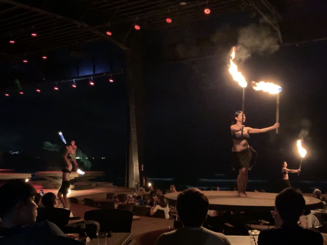 予約したのは一番安いプランだったのでステージからは離れてましたが、開演まての間にダンサーの方達と写真を撮れたり、子供連れの方達はダンスレッスンを受けたりされていました。他のスタッフ達もカメラを向けると笑顔でポーズをとってくれたりと楽しめました。料理は昼に食べすぎてしまいほとんどたべれなかったのですが、味は良かったです。メニューは思ったよりも少なかったですがメインはショーなので妥協出来ます。生憎当日は曇りだったので夕日は見えませんでしたが乾季に行くなら最高の夕日が見れそうな立地でした。