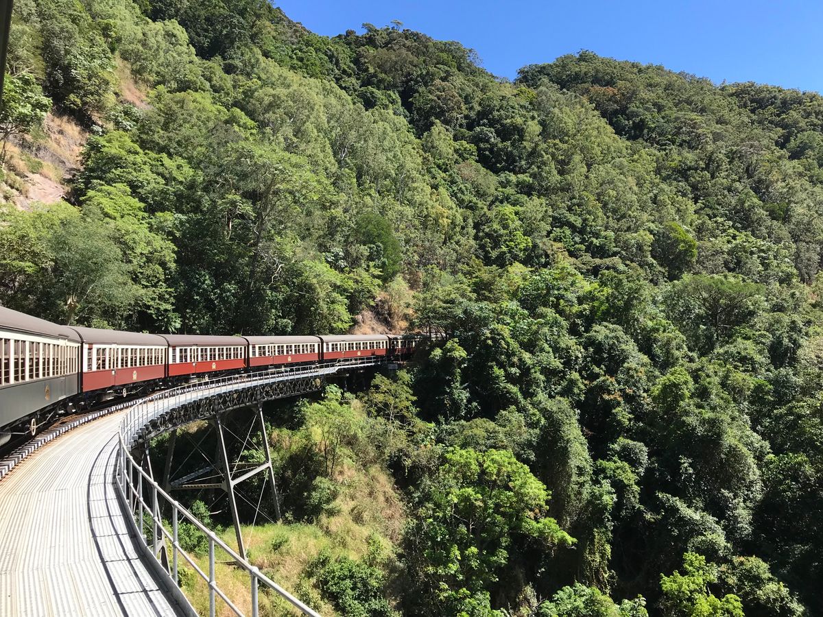 急遽ゴールドクラスにアップグレードしたキュランダ列車は正解でした。飲み放題に軽食がつきますが次から次へと軽食が出され、おいしいので全部食べたらお腹いっぱいに。もちろん車窓の眺めや椅子の座り心地までゴールドクラスで優雅な気分でした。キュランダにつくと昼食でオージーバーガーを頼みましたがかなりのボリュームです。すでにお腹いっぱいでしたがおいしいので完食。キュランダ散策も楽しかったです。アーミーダックはガイドさんのノリがよく思った以上に楽しめた。コアラ抱っこも一瞬での出来事でしたがとても楽しく可愛かった。あまり時間は無かったですがミニ動物園へも別料金を払っていきました。ガイドさんの要領の良さと指示でなんとか全部回ることが出来ました。最後はスカイレール、キュランダからケアンズ市内を一望できてオススメ。最後は解散場所でじゃんけん大会もあり、最初から最後まで忙しいくらい楽しかったです。