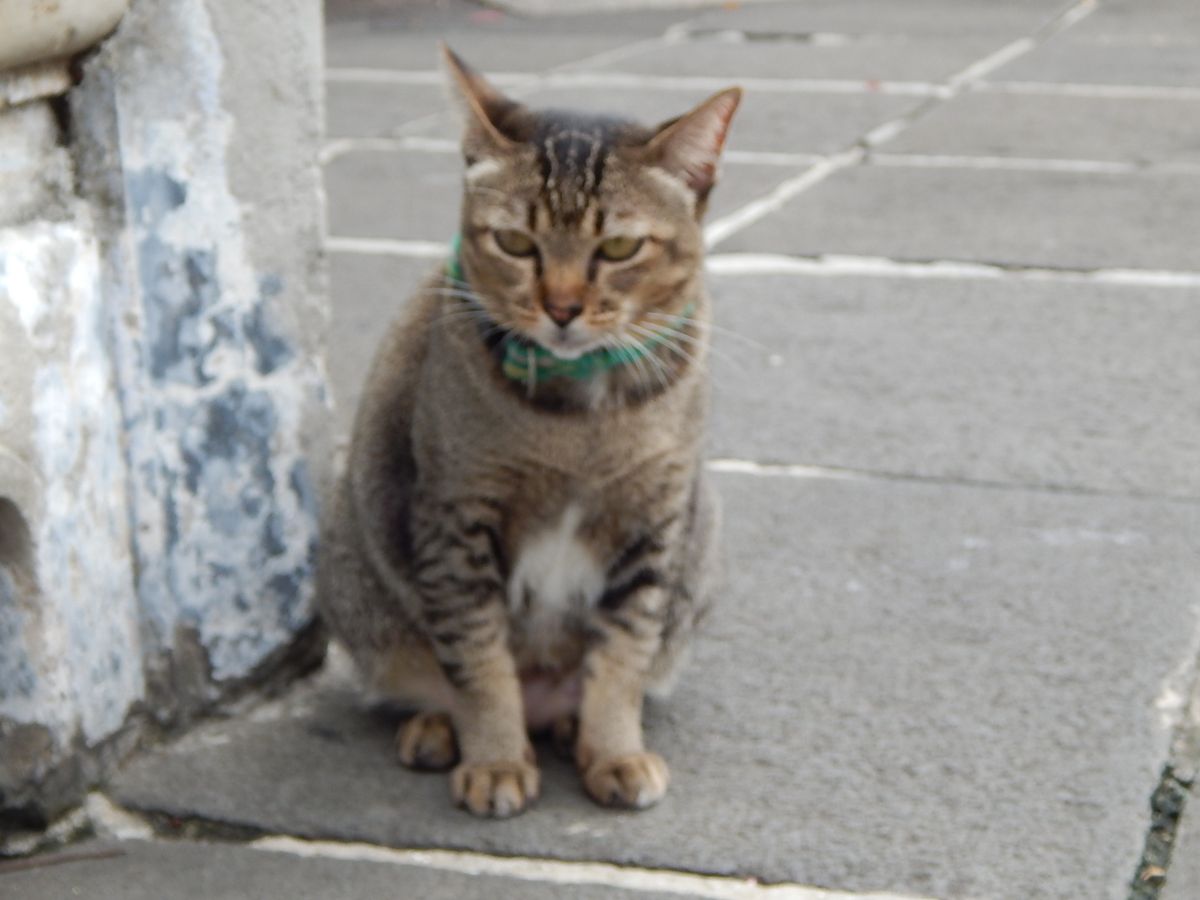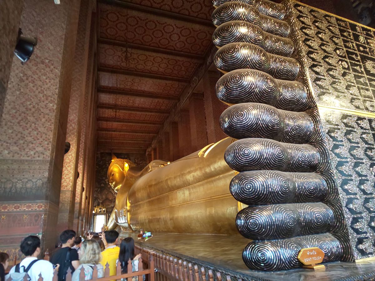 暁の寺は船から見ても、近くで見ても美しく、凄かったでした。これまで持ち歩いていたコンパクトカメラを今回から本格カメラに変更してよかったと、特に帰国現像してから思いました。暁の寺に住んでいるらしいネコがかわいかったのでパチリ。世界遺産の黄金の涅槃像の巨大さにも圧倒された。おそらくブッダの歴史をあらわした足の裏とともに記念撮影。仏教徒が90%以上のタイの国には親近感とともに、文化の奥深さに感銘したツアーでした。
