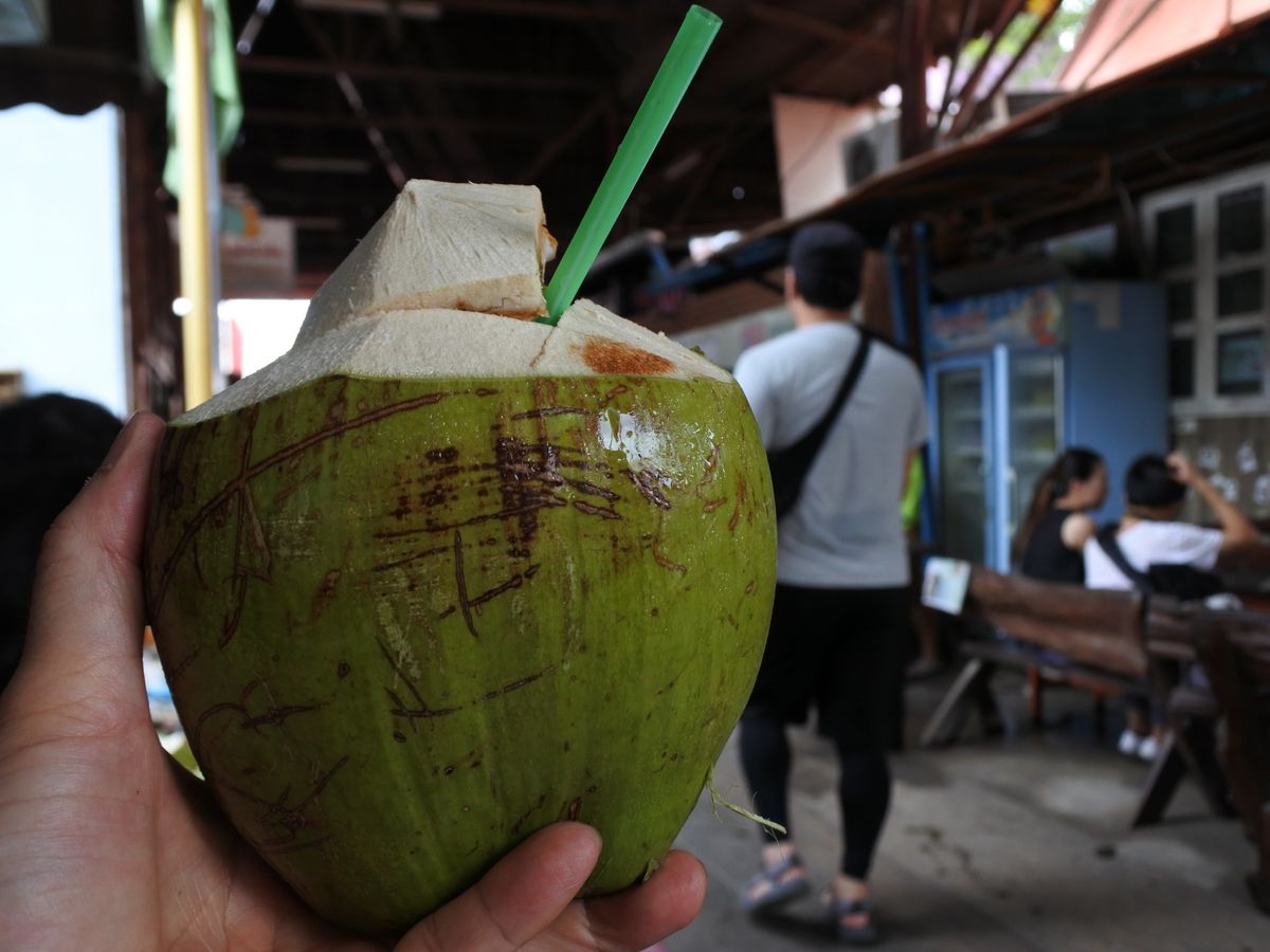 水上マーケットは雰囲気バツグン!ココナッツのアイスがメチャウマです。お店で売ってるのは、観光地レートでした。ただ、周りを蠢くエンジン付きボートの排ガスはいただけませんね。
