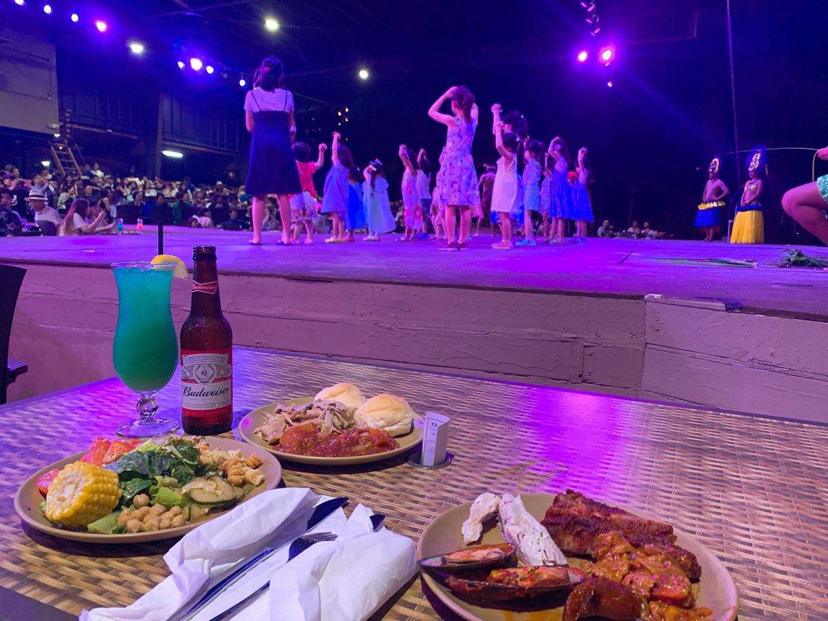 デラックスコースは少し上段のフロアにあるテーブルに座ります。私達はスタッフの声かけで一段下がった所のテーブルからショーを見れました。ステージ前はバイキングのコースの方です。デラックスコースの食事の量は、ボリューミー過ぎずな感じ。デザートは少し残してしまいました。持ち帰りは不可。ノンカクテルは別に注文でサービス料金がおそらく二人分、($2)追加されてました。