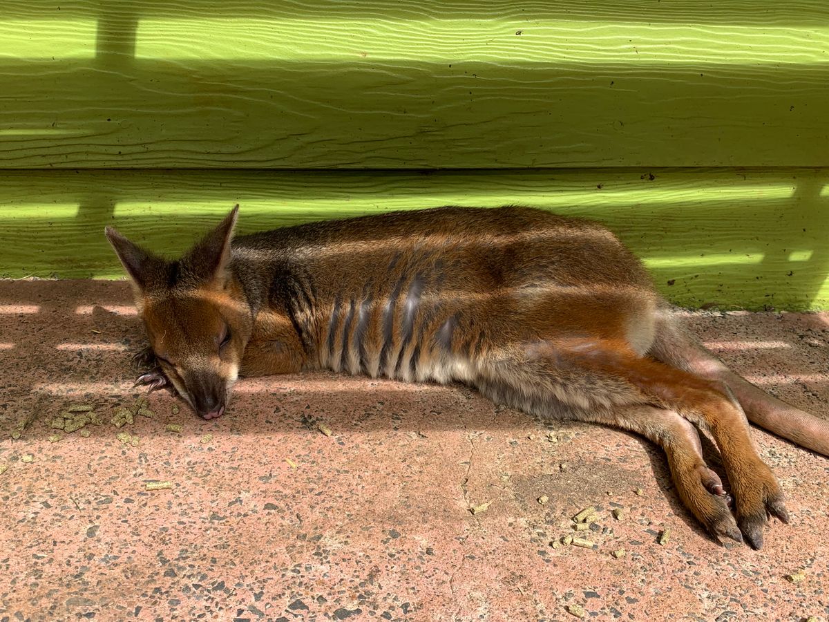 レインフォレステーションにあるミニ動物園では放し飼いのワラビーを触ることができ、もう感無量!