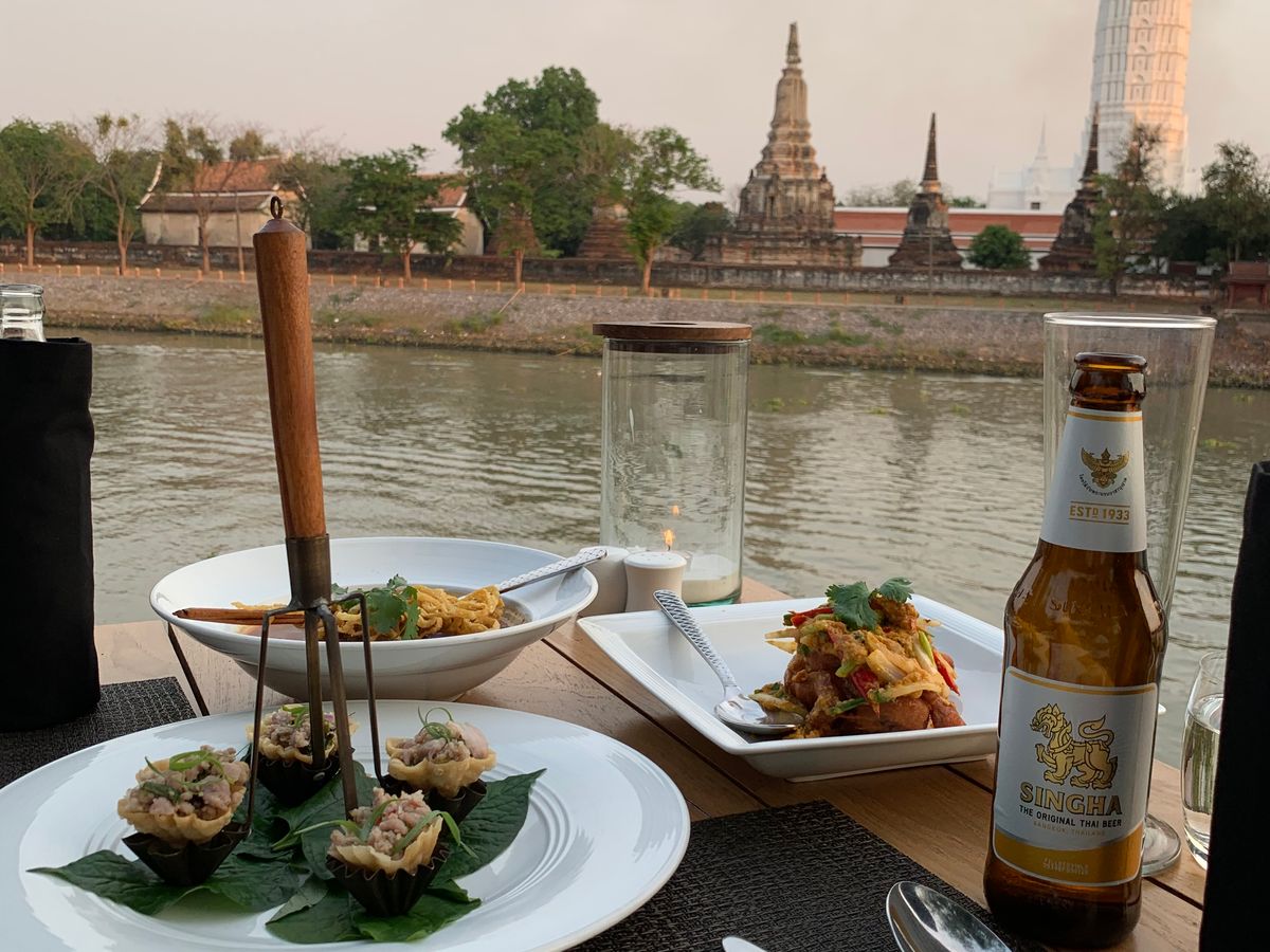 とてもお洒落なブティックホテル内のレストランで、日が暮れていく川向こうの遺跡を見ながらのディナーも期待以上で、前菜、マッサマンカレーとイエローカレー、空芯菜炒め、どれも美味しかったです。