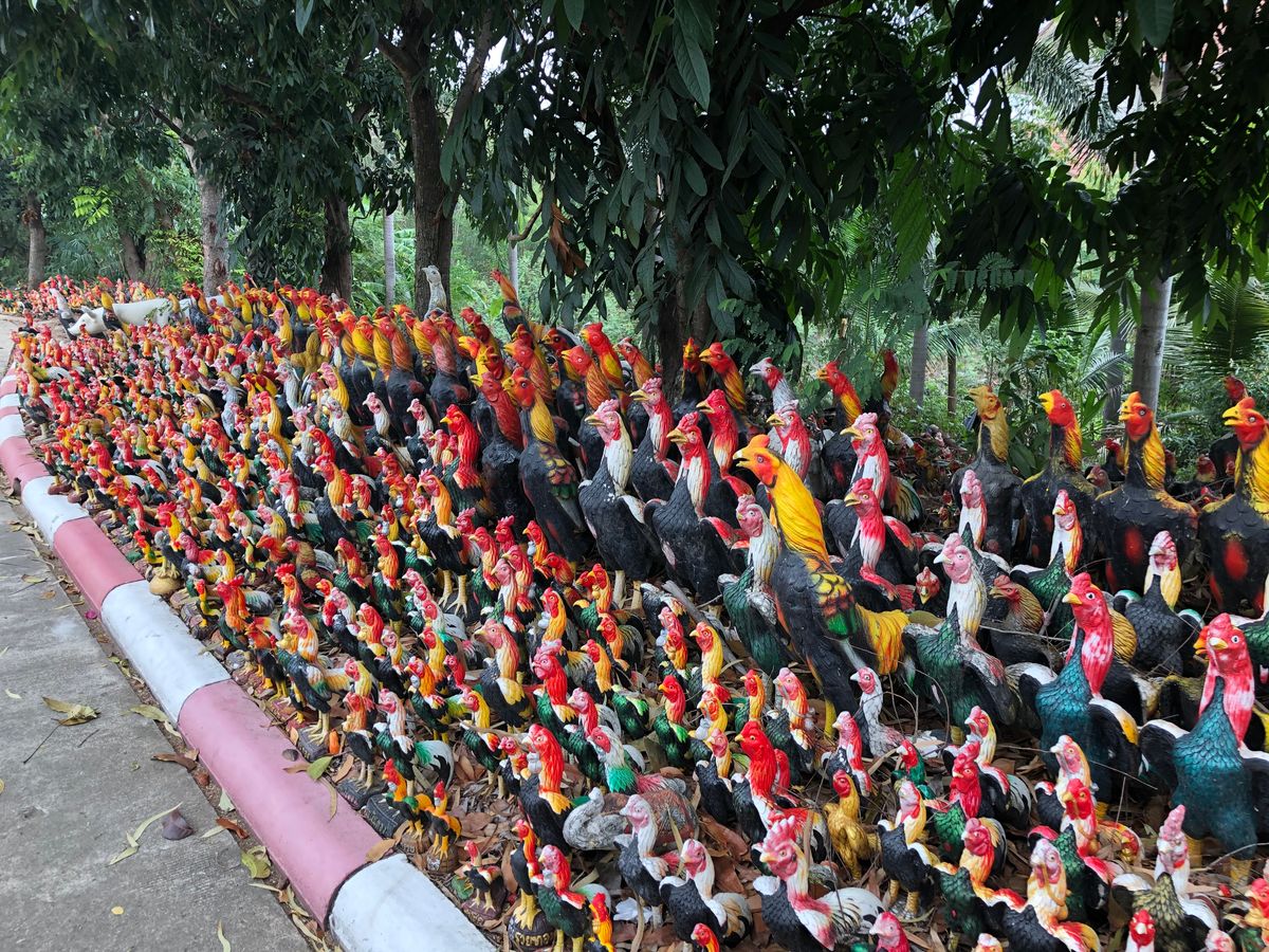 ワット・ヤイチャイモンコンでは、ガイドブックにも載ってないようなインスタ映えスポットに案内していただきました。願掛けをして願いがかなうとシャモの置物を奉納するそうで、ものすごい数の大小様々なシャモ像が立ち並ぶ姿は圧巻でした。