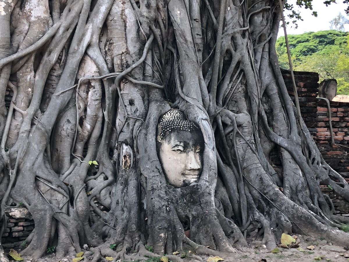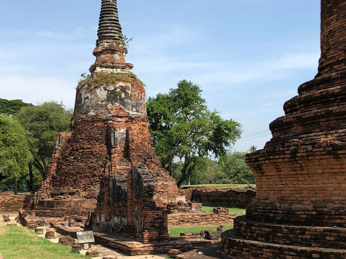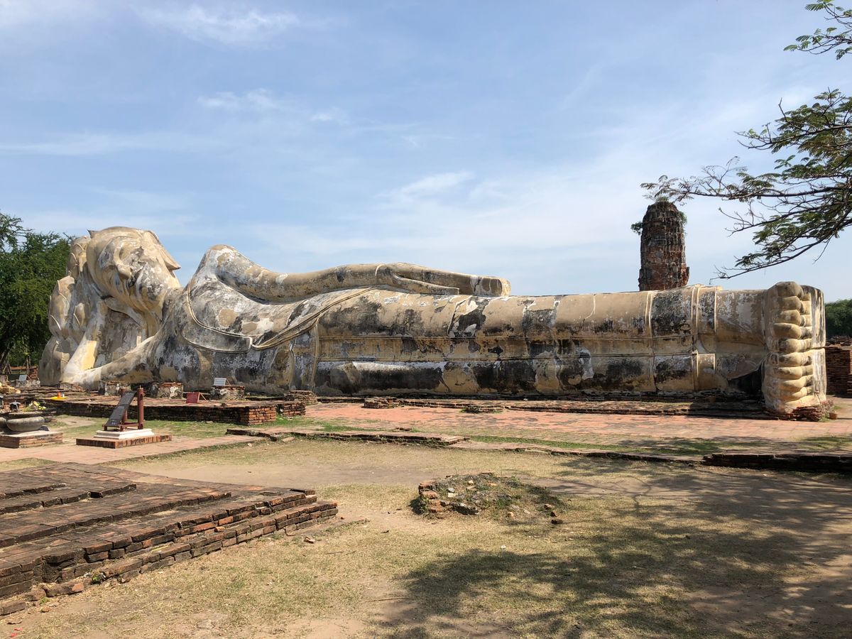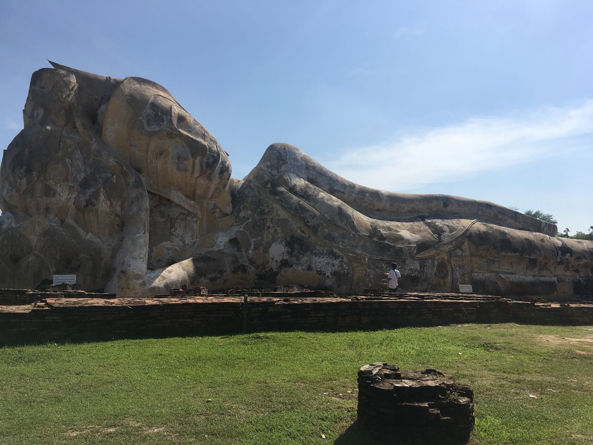 今回初めてのバンコク旅行で、絶対観たかったアユタヤ遺跡のツァーに参加しました。朝食も食べる時間もあり、半日ツァーだったので午後からもフリータイムもありと、とても充実した1日でした。ガイドさんのサラさんは優しく、丁寧に色々な歴史等説明してくれました。複雑な歴史がある世界遺産、ミャンマー軍に仏様の頭を切り落された話はとても印象に残り、戦争の悲惨さを後世に伝えているようでした。ワット・プラシーサンペットで、はアユタヤの3人の王の遺骨を納めた3本の仏塔が印象的でした。 ワット・ヤイチャイモンコンでは、高さ72メートルの仏塔があり、仏塔から下を眺めると何台もの仏様が見え素敵でした。ワット・マハタートでは、有名な木の中で眠る頭だけの仏様がいます。胴体から地面に落ちその後、木の成長とともに根元にとり込まれ、現在の姿となった仏様。もう誰にも破壊されないように木が守っているようで、自然とのコラボレーションの姿は不思議で美しい光景でした。ワット・ロカヤスタでは駐車場から30秒!車を降りたら、スグそこにどーんと横たわる全長28mもの巨大仏様は微笑みを浮かべ、まるでお昼寝でもしているかのようでした。ワット・チャイワッタナラームでは、朽ちたレンガの遺跡が連なり、空はどこまでも青く、緑と遺跡の調和はとても素敵でした。