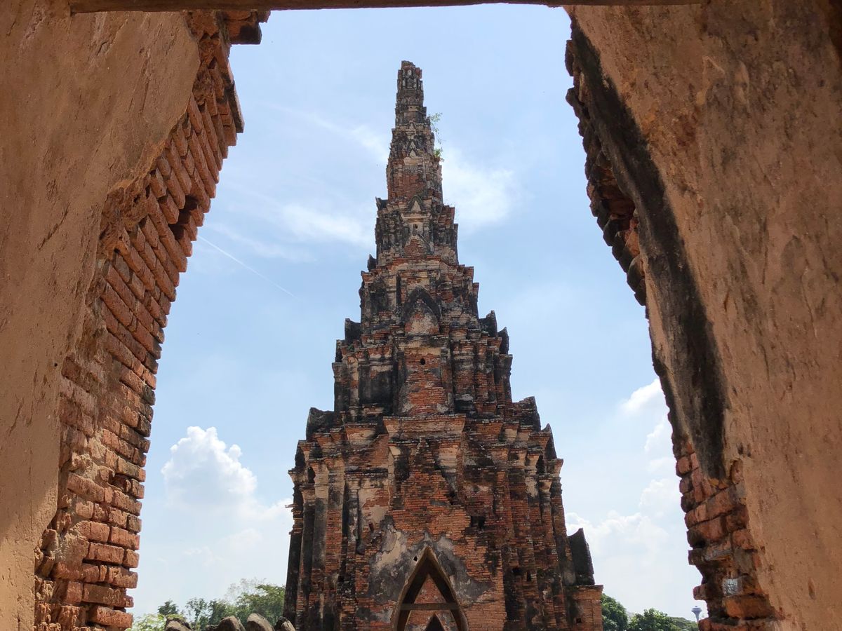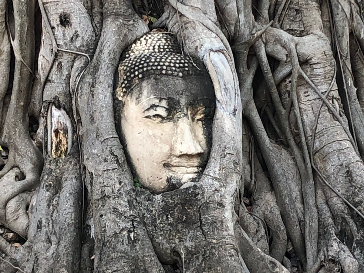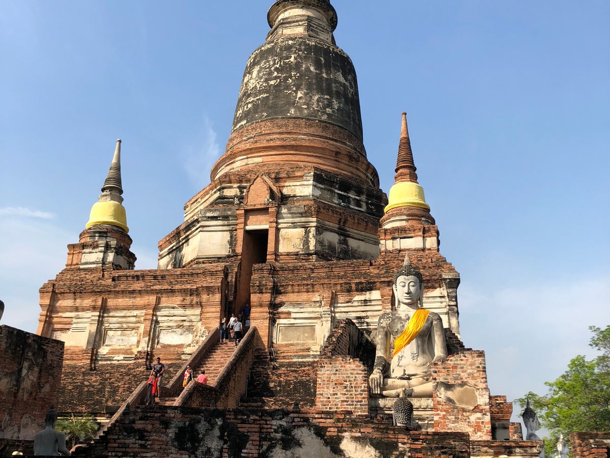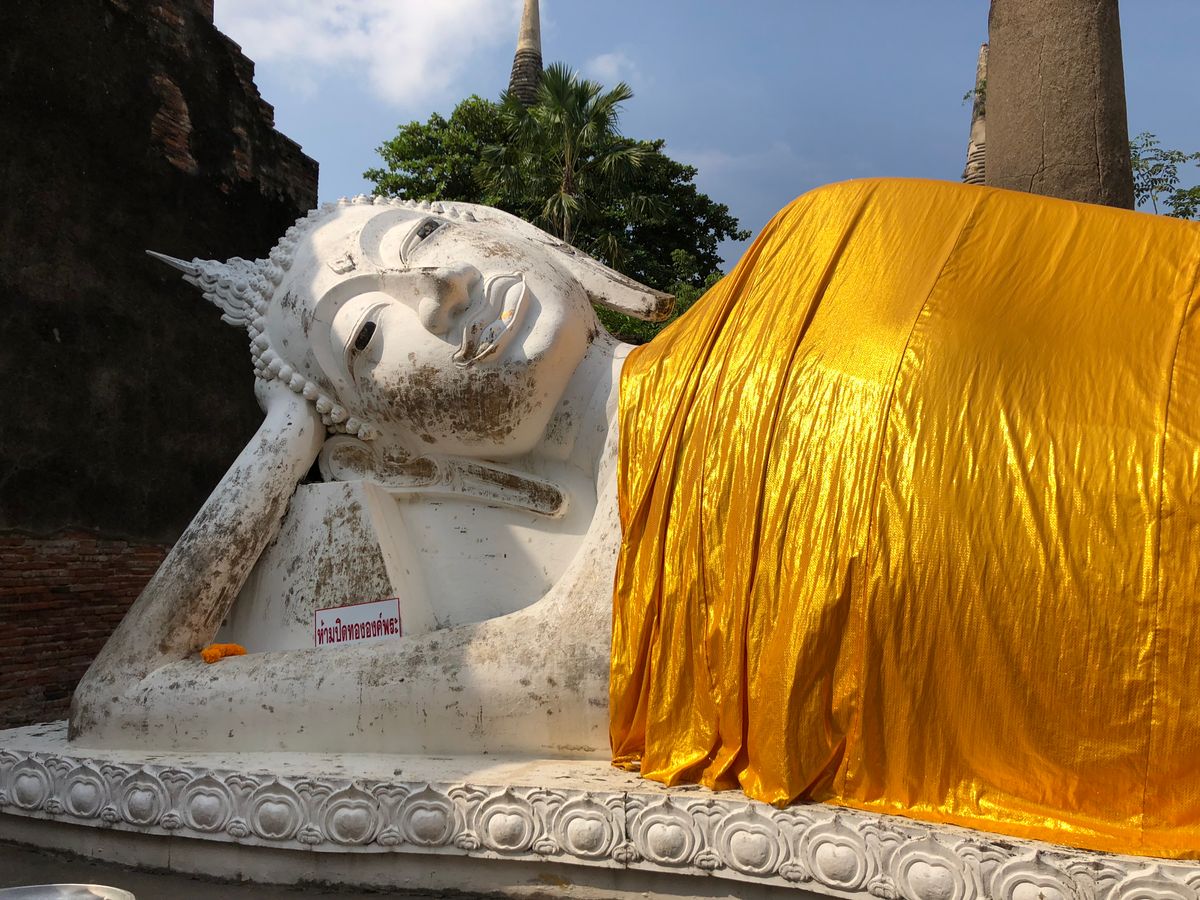 今回初めてのバンコク旅行で、絶対観たかったアユタヤ遺跡のツァーに参加しました。朝食も食べる時間もあり、半日ツァーだったので午後からもフリータイムもありと、とても充実した1日でした。ガイドさんのサラさんは優しく、丁寧に色々な歴史等説明してくれました。複雑な歴史がある世界遺産、ミャンマー軍に仏様の頭を切り落された話はとても印象に残り、戦争の悲惨さを後世に伝えているようでした。ワット・プラシーサンペットで、はアユタヤの3人の王の遺骨を納めた3本の仏塔が印象的でした。 ワット・ヤイチャイモンコンでは、高さ72メートルの仏塔があり、仏塔から下を眺めると何台もの仏様が見え素敵でした。ワット・マハタートでは、有名な木の中で眠る頭だけの仏様がいます。胴体から地面に落ちその後、木の成長とともに根元にとり込まれ、現在の姿となった仏様。もう誰にも破壊されないように木が守っているようで、自然とのコラボレーションの姿は不思議で美しい光景でした。ワット・ロカヤスタでは駐車場から30秒!車を降りたら、スグそこにどーんと横たわる全長28mもの巨大仏様は微笑みを浮かべ、まるでお昼寝でもしているかのようでした。ワット・チャイワッタナラームでは、朽ちたレンガの遺跡が連なり、空はどこまでも青く、緑と遺跡の調和はとても素敵でした。