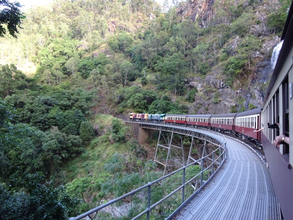 スカイレール → レインフォレステーション(動物園散策、アーミーダック、アボリジナルダンス)→ ランチ → キュランダ村散策 →キュランダ鉄道で戻る