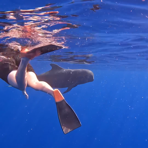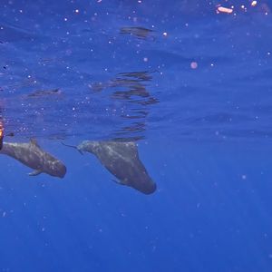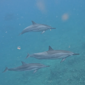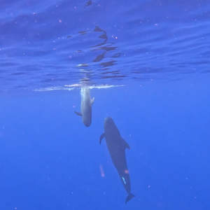 お父さん、お母さん、子供の3頭で、最初のうちはお父さんが警戒していましたが、敵ではないと分かったらしくお母さんが子供に呼吸の仕方を、私達の目の前で何度も繰り返しトレーニングしてくれました!何度かは真下から上がって来て、少し怖いぐらいでした(笑)その後さよならしたのですが、何と!再びお母さんと子供が戻ってきて、子供を紹介する様に、再び私達に泳いでいる子供を見せにきてくれました!!