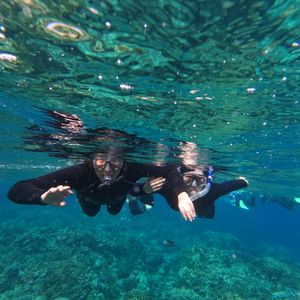 小学生の子供2人と共に参加しました。最初から足のつかない場所に入るので少し怖かったようですが、スタッフの皆様が気にかけてくださり、浮き輪に捕まりながら移動させてもらえて助かりました。マスクに水が入ってしまったり海水が口に入ってしまったりで落ち着きませんでしたが、綺麗な魚をたくさん見ることが出来ていい思い出になりました。
