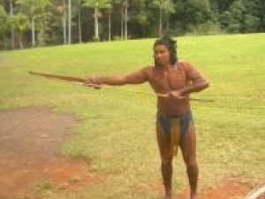 槍投げは見学でしたがブーメラン投げに挑戦。子どもは戻ってくるような見事な投球(投ブーメ)でしたが私は地面にたたきつけてしまい 危険な人物ねーといわれてしまいました。日本でも少し広い場所があれば面白い遊びになるのになーと・・・最後には鳥を取るときに投げるパターンを見せてくれました。いっぺんに4−5枚のブーメランを投げるんですがこれも圧巻でした。