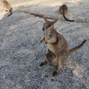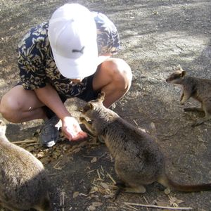 ケアンズに来て2日目にこのツア-に行くことにしました。14時に出発して、最初に蟻塚を見ました。とても大きな蟻塚で、車で走っているとあちらこちらにいっぱいあるのですが、教えてもらわないと判らないものでした。その後サトウキビ畑やバナナ畑を通って、ロックワラビのいる岩場へ行きました。とても可愛いくて、手渡しで餌をやることができました。途中の草原には、野生のカンガルーやワラビ、襟巻トカゲも見ることができました。そして、熱帯雨林特有の木である絞め殺しの木、カ-テンフィグツリ-のでかい木も見せてもらいました。それから川に行って、カモノハシを探しに行きました。幸運にも40分くらいで15分くらいは姿を見せてくれました。そこにはお母さんが交通事故で亡くなったワラビの赤ちゃんを連れて来てくれて、抱っこをすることができました。そして、バーベキュー場へ行くと案内人のブレッドさんがカンガルー肉やわにの肉、オージ-ビ-フ等を焼いてくれていました。そこには、ポッサムも餌を食べに来ていました。食後は夜の真っ暗な熱帯雨林に入っていき、ライトを照らしながら、ちょっと待っての木等の説明を受けました。そして最後に草原で満天の星を見ることが出来ました。南十字星や蠍座、天の河はもちろんブラックホールまでも見ることができました。人生最高の思い出になるツア-でした。