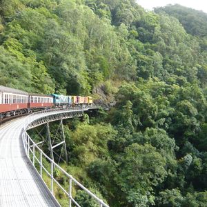 ケアンズ滞在3日目に参加。朝はバスでお出迎えがあり、スカイレール駅に到着。その後は完全自由行動です。まずはスカイレールでキュランダに。ダイヤモンドビューにアップグレードしました。足の下が見れるのは圧巻ですが、それ以上に並ぶ列が別なので、非常にスムーズにスカイレールに乗ります。キュランダまでの駅は2駅ありますが、途中下車がお勧めです。熱帯雨林とバロン滝が楽しめます。キュランダでは、あまりやる事がありません。ランチを食べた後、コアラ抱っこへ。ここではカップルで写真を取ると、2人+コアラで写真を撮ってくれます。その後のハイライトはキュランダ鉄道。ゴールドクラスにアップグレードしましたが、素晴らしい体験でした。お酒も飲めるし、おつまみも出てきます。大変お勧めです!