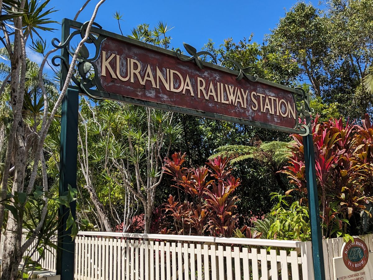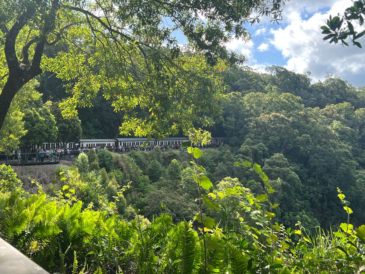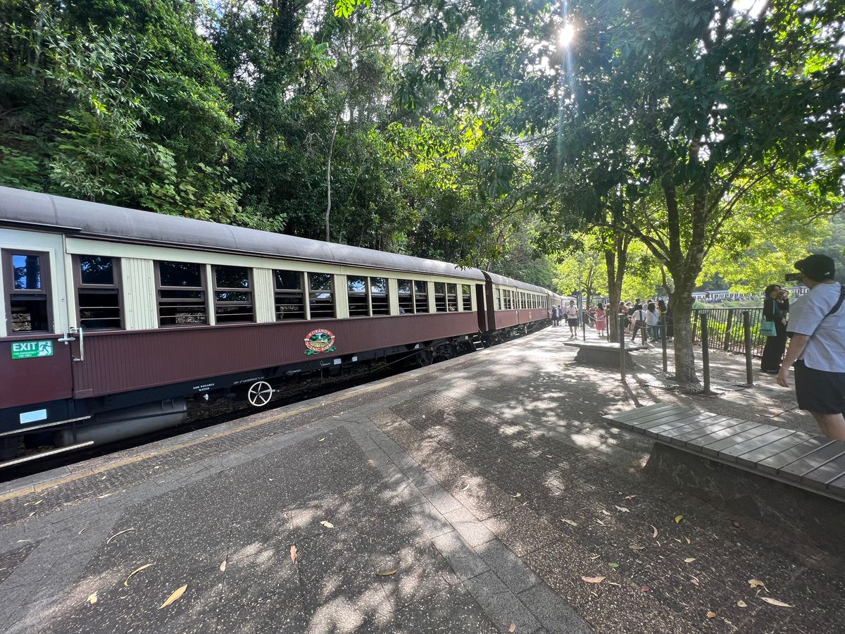 復路は鉄道に乗り、Cairnsまで戻ります。途中1駅で下車し、散策できました。ただし、鉄道の座席のせいかもしれませんが、スカイレールと比較して鉄道からの眺めが良いとは言えず、個人的には往復ともにスカイレールが良いように感じました。
