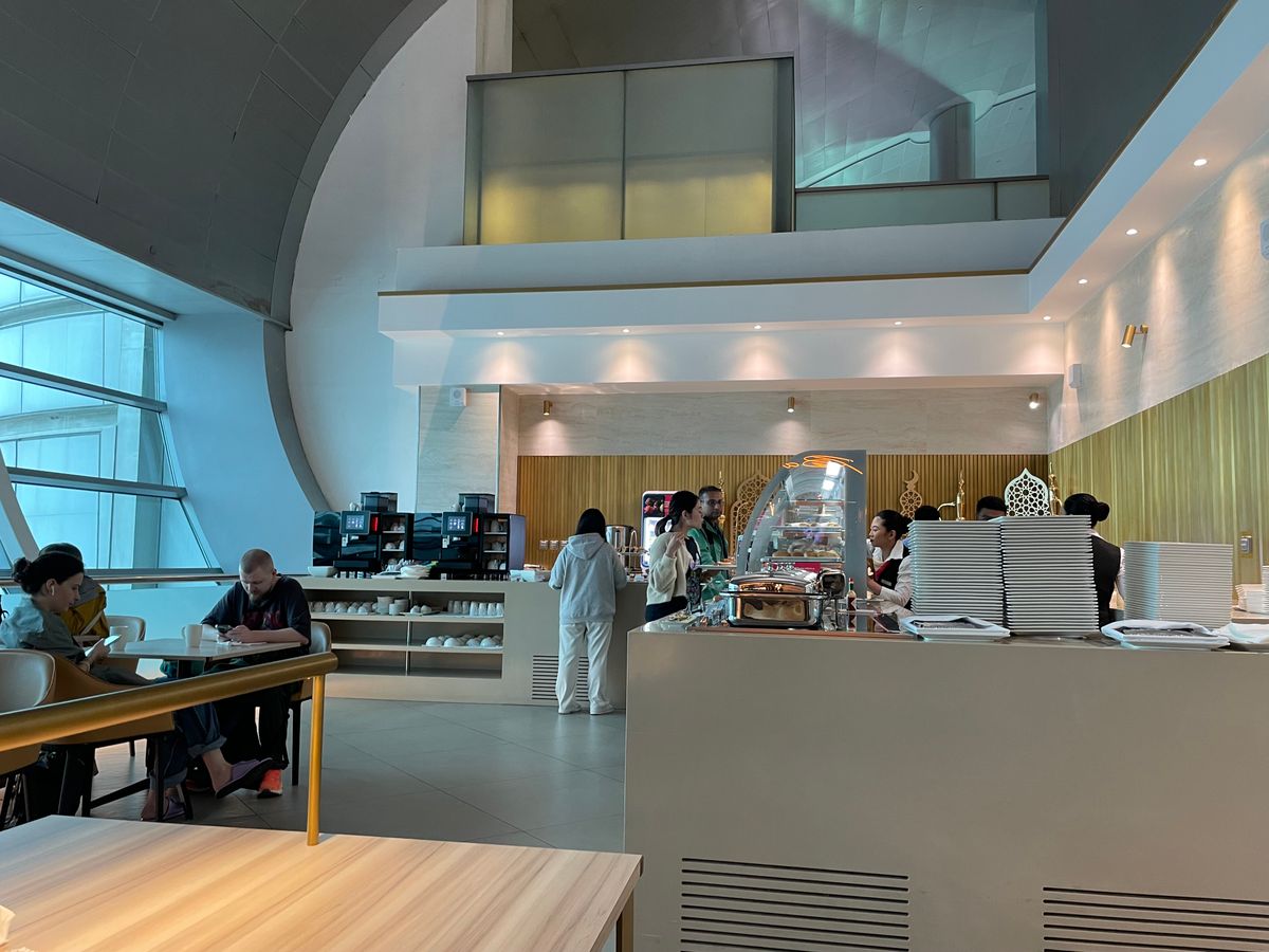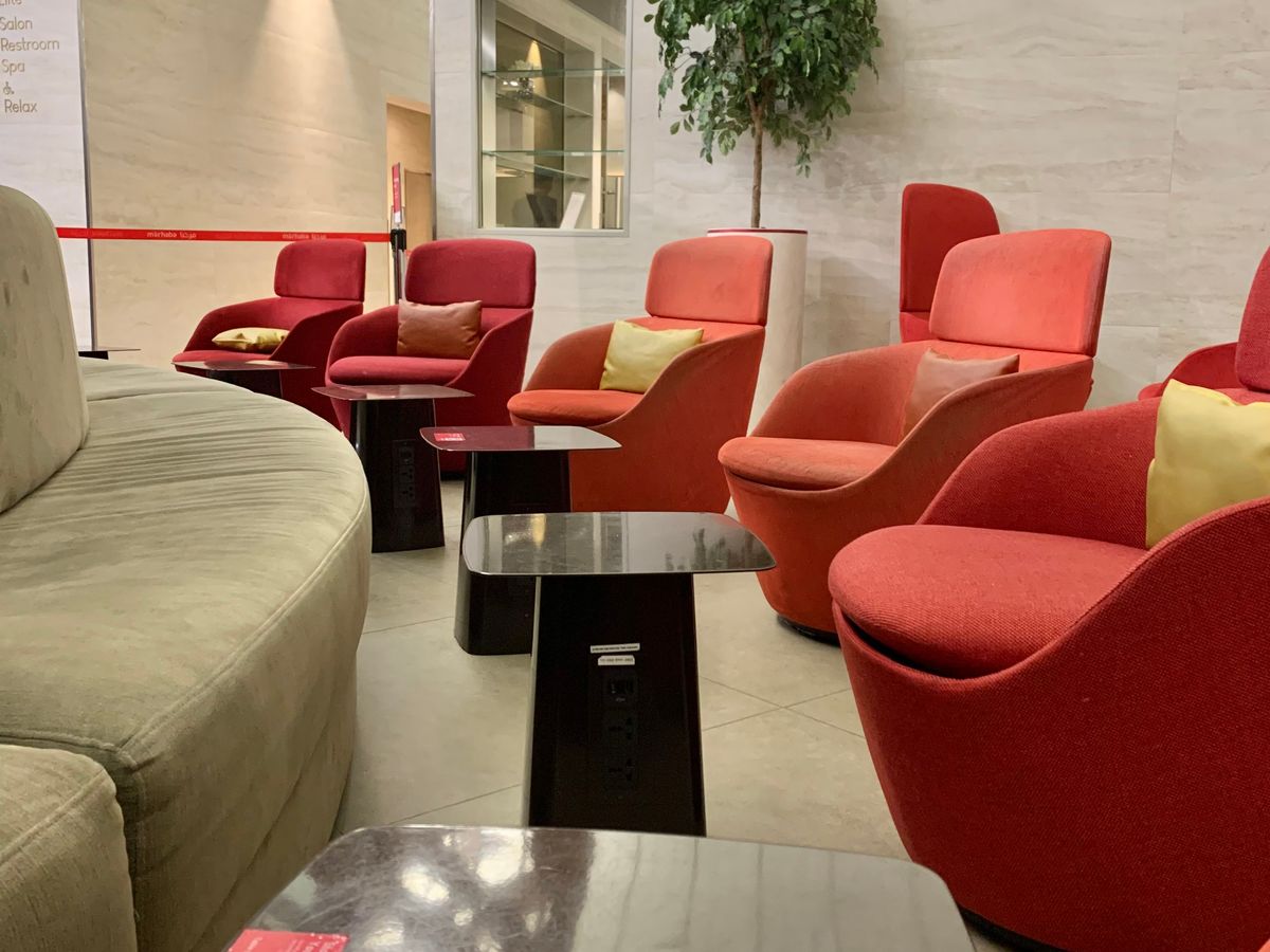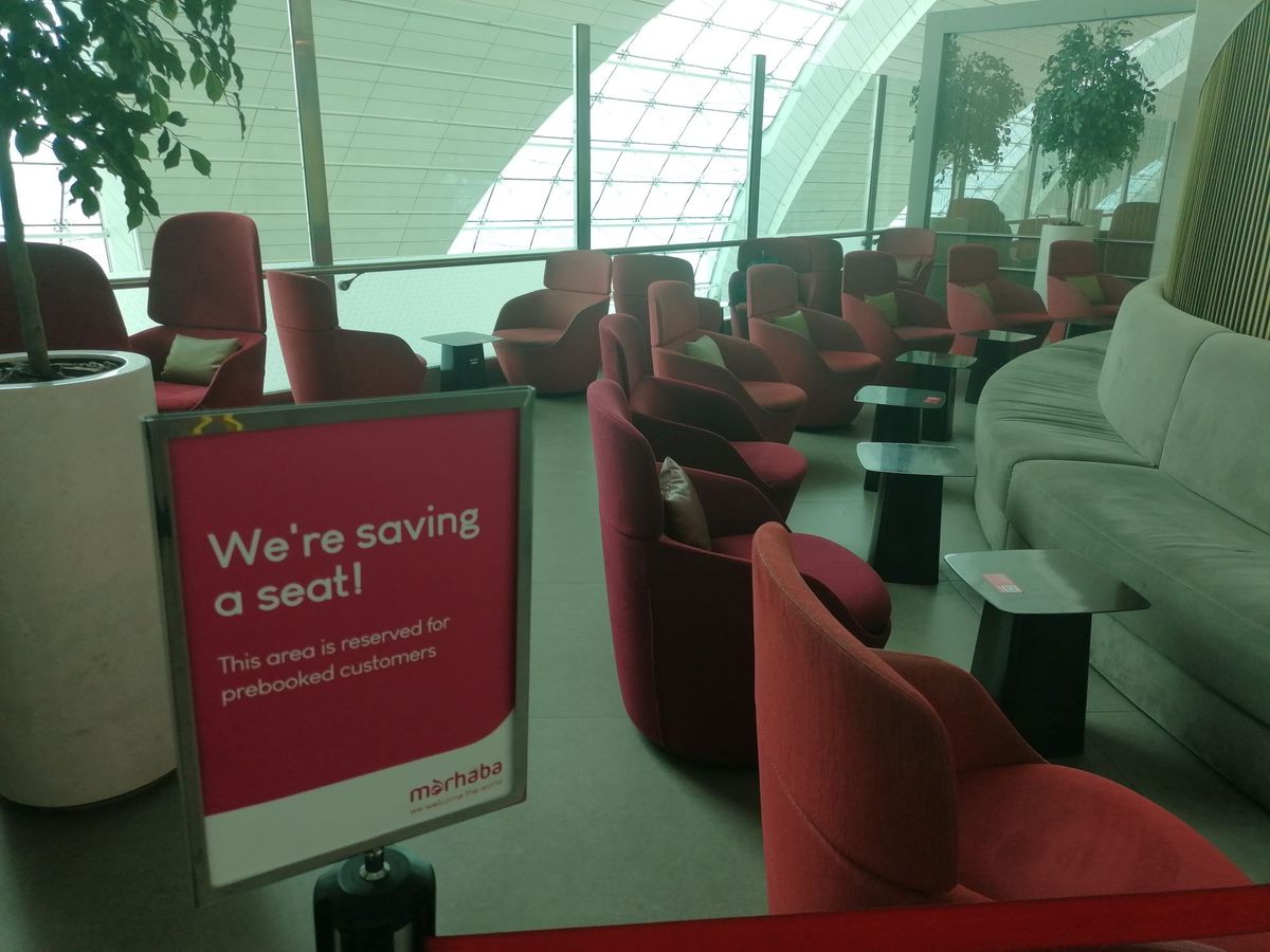 コンコースAを利用。事前予約者専用にスペースが設けられており、人は多いが席は確保できます。しかし、睡眠を取ることは難しいかもしれません。ご飯はまあまあです。アラビアンコーヒーとデーツが美味しかったです。