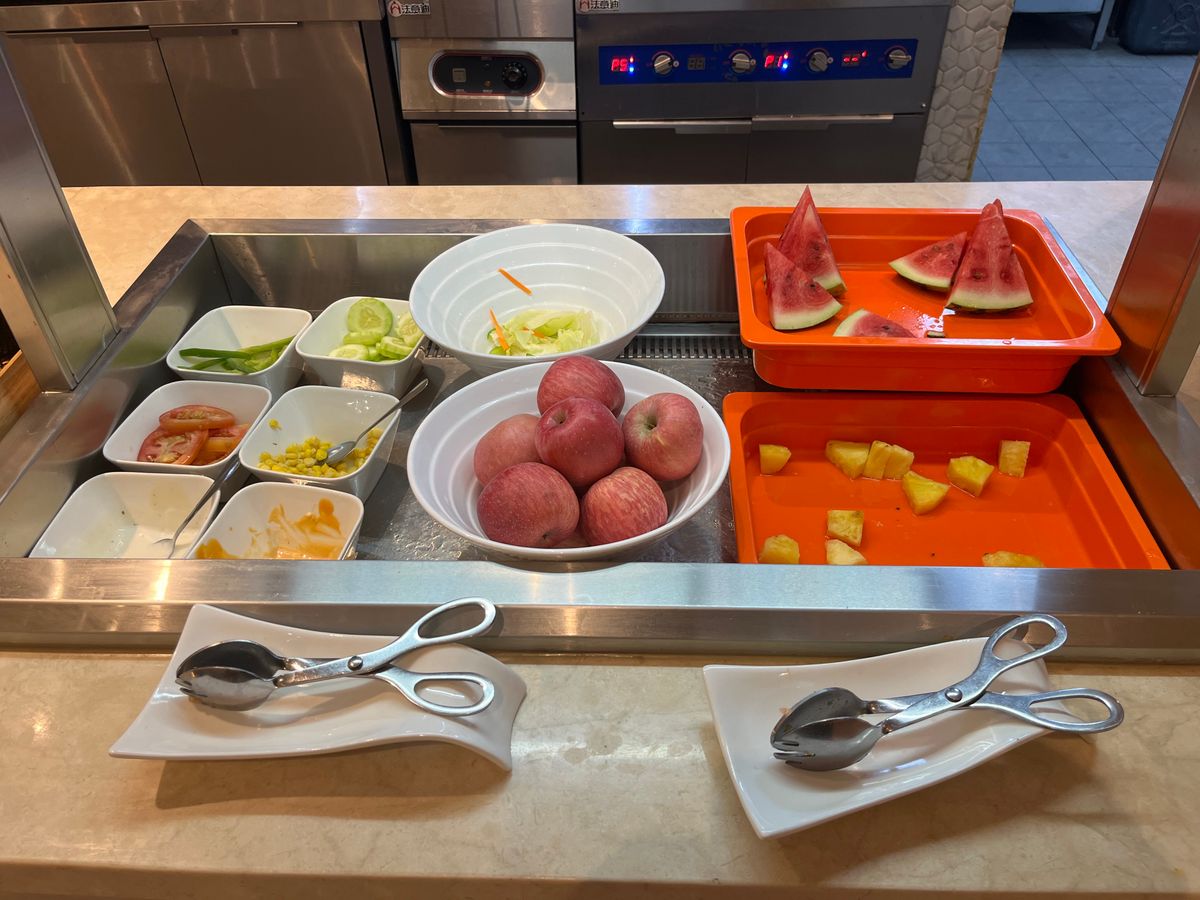 料理の種類は多くないですが、ちょっとしたサラダバーと果物、フィリピン風焼きそばのパンシット、醤油っぽい味付けのチキン、ポテトなどがありました。オーダーすればラーメンっぽい麺も作ってくれるようです。飲み物は冷蔵庫にソフトドリンク各種とタイガービール、コーヒーや紅茶、デトックスウォーターというラインナップ。