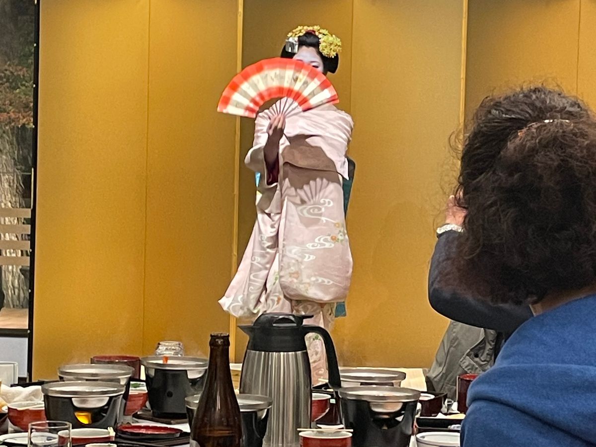 食事が始まってすぐ舞妓さんが来て、踊りの披露と撮影会。