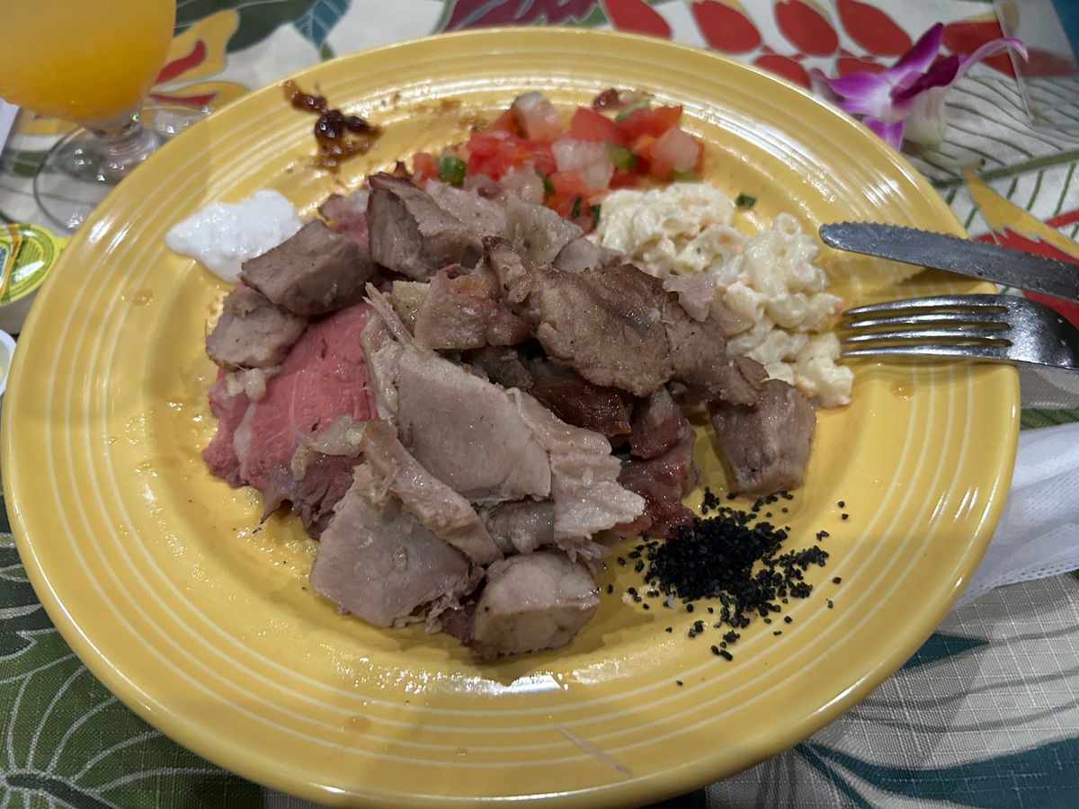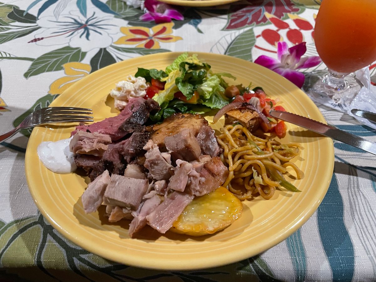 食事もハワイの伝統料理をはじめ色々な料理を食べることができます食事をしているとフラダンサーの方が席の間近でダンスを時折披露してくださり楽しめます‼︎もちろんフルーツやケーキ、アイスなどデザートもたっぷりでお腹いっぱいになり大満足でした‼︎