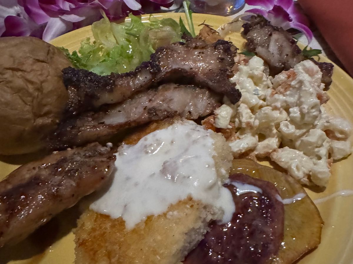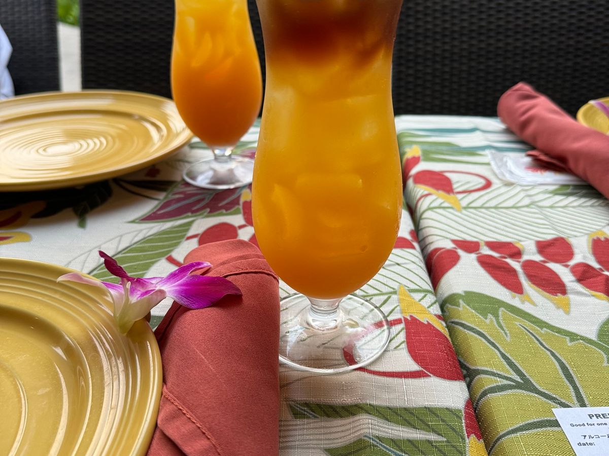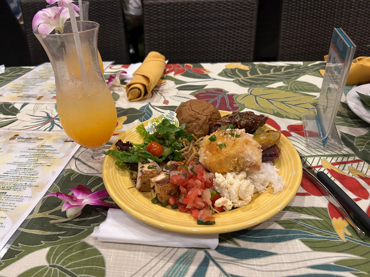 まずはディナービュッフェについて、食べるところはオープンテラスで夜風が心地よく、テーブルにつくと、髪飾り用に生のデンファレの花が用意されておりハワイの飲み物を飲みながら気分はハッピー