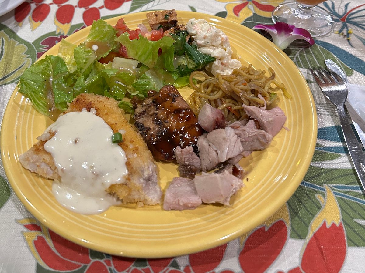 野外でビュッフェを食べることから始まり、天気も良くとても気持ちよかったです。ご飯もハワイアン料理を味わえていい思い出になりました。夕食中は軽いショーもあったりフラレッスンもあって楽しくお食事ができました!