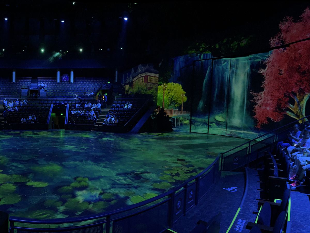 9月の旅行3日目の18時30分開演を予約して行きました。予約時に座席指定まではできなかったので、見えずらい席だと残念過ぎるからと、ゴールドシートを予約しました。実際に会場へ行ってわかったのですが後ろのほうの席でもちゃんと見れるよう、座席の一高さを配慮した円形の劇場でした。なので割安のブロンズ席でも大丈夫だと思います。開演時間の少し前から、ステージの案内役ピエロがオープニング時間が過ぎても同じ調子でジョークを繰り広げていて、数十人ほどお客さんも少し遅れて入ってきたり、ゆる~い感じで始まりましたが、開始10分後くらいからガラッと変わり、高い天井大きな扉大きなステージが下りてきたり、滝のような水が流れ落ちたり、会場の真ん中の水が急にあふれてきたり、広い空間を最大限使った演者さんたちのパフォーマンスが圧巻で、どこに注目べきかわからなくなるくらいスケールのある圧巻のパフォーマンスでした。テンション上がりっぱなしの大満足なショーでした。お勧めです。
