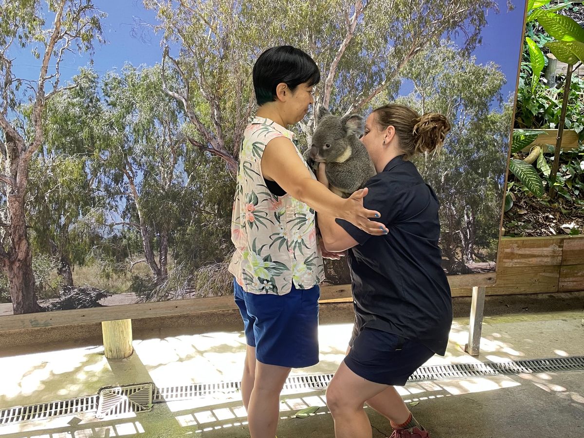 眠っているコアラを起こして私たちのために頑張ってくれているので,コアラに申し訳ない気持ちになりましたが,抱いたコアラはもふもふで大人しくとってもかわいいコアラでした。スタッフの方も丁寧に抱き方を指示してくださり,もう1人のスタッフは私たちのスマホでも写真を撮ってくださいました。コロナ感染症は関係ないと思いますが,始めはアルコール消毒,終わりは石鹸で手洗いとコアラと私たちのためにしっかりと対策していました。オーストラリアでも数少ない貴重な体験,おすすめです。