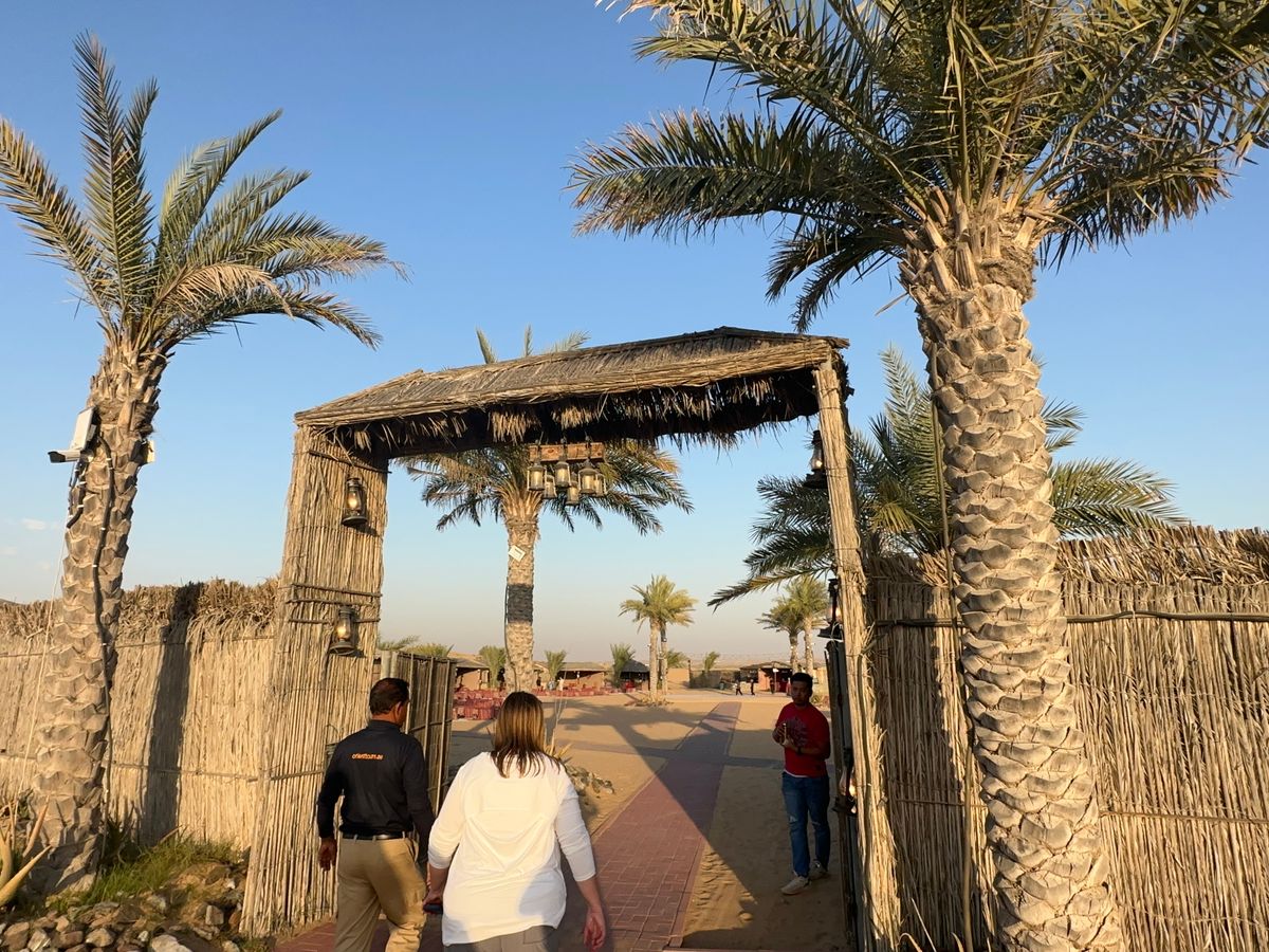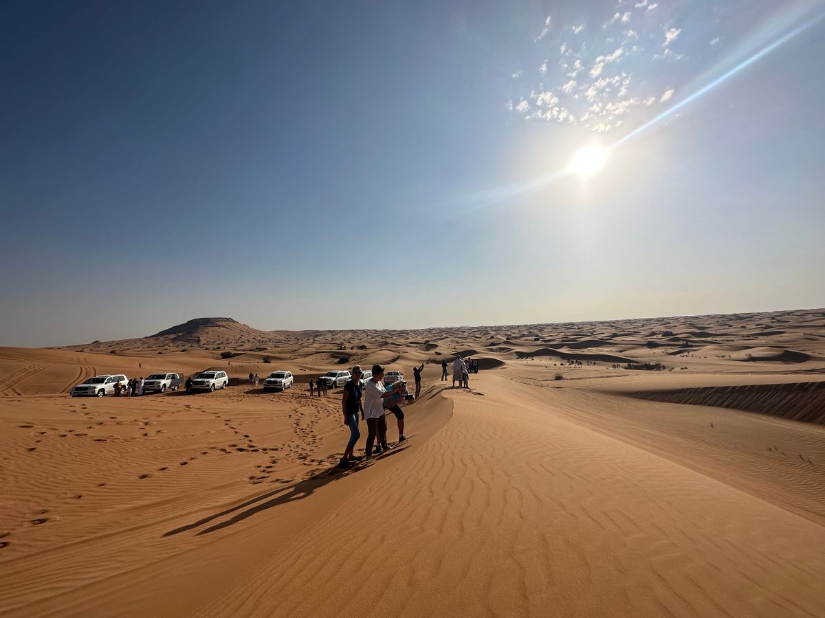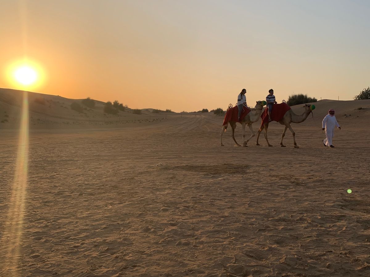 砂丘まで休憩含めおよそ一時間、広大な砂漠が広がります。砂丘をランクルで縦横無尽に走り楽しみました。ただ不運なことに前日の雨の影響で砂が硬くなっていて、ドライバーさんが頑張っていましたが、横滑りはあまりしませんでした。キャンプ場に着きラクダに乗ります。ぐるっと50mぐらいでしょうか、数分でした。その後キャンプ場の席に案内され、中央に設けられたステージ上でダンサーの踊りを楽しみながらブッフェタイプの食事などを頂きます。息子のバースデイ用にケーキをオプションで頼んでおいたので、アナウンスとともに運ばれてきました。思ったより大きなチョコケーキに、他の参加客からの拍手もあって息子は大喜び。ケーキが大きすぎるので切って、周りの方々へお裾分け。アフリカ系の方にお祝いされながら一緒に座って写真を撮り良い思い出となりました。