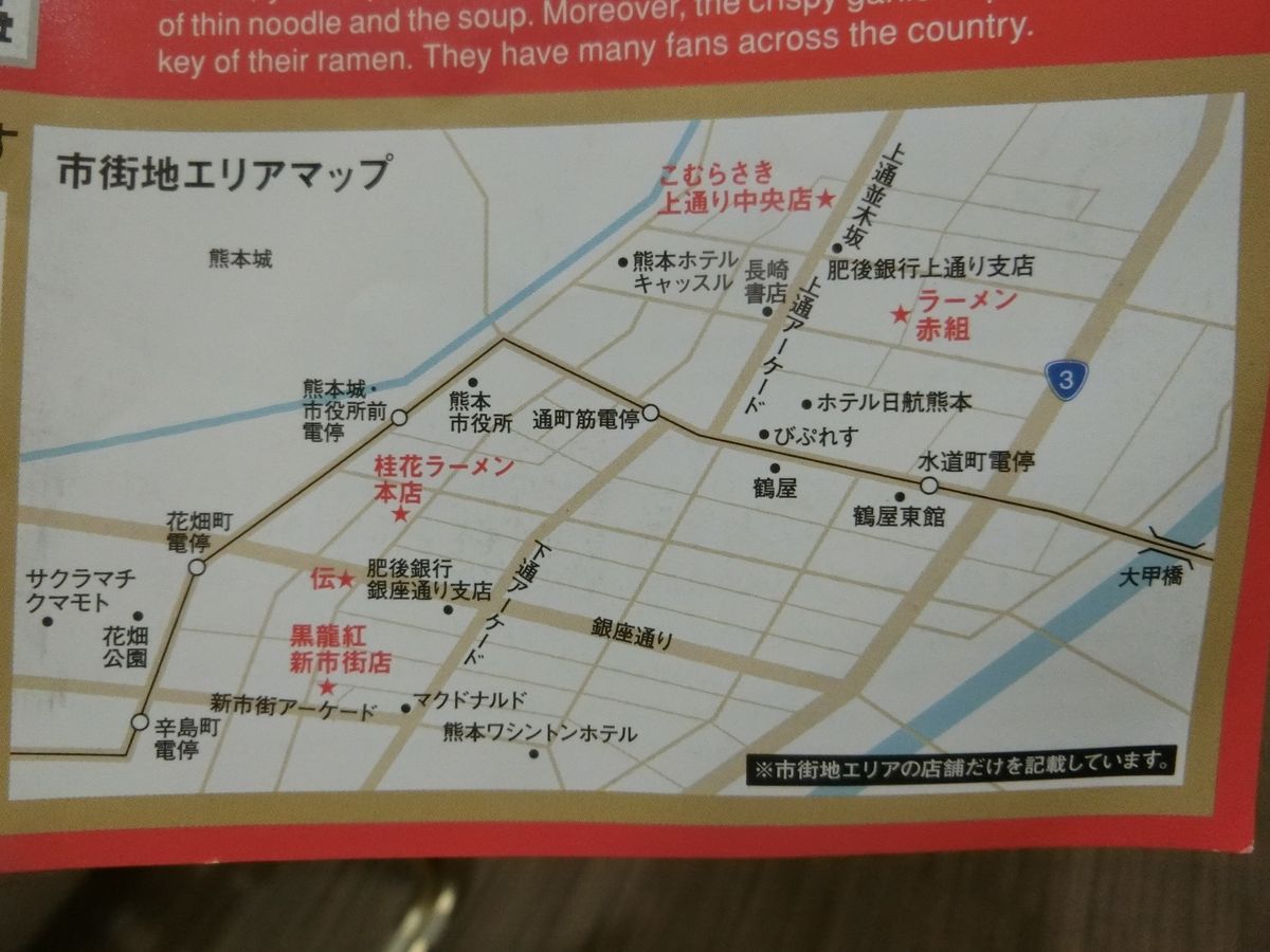 クーポンの受取は熊本城や空港・熊本駅で可能ですが、対象となるラーメン屋さんの殆どは熊本城から少し離れた繁華街に集中しているので、下調べしておく必要があります。