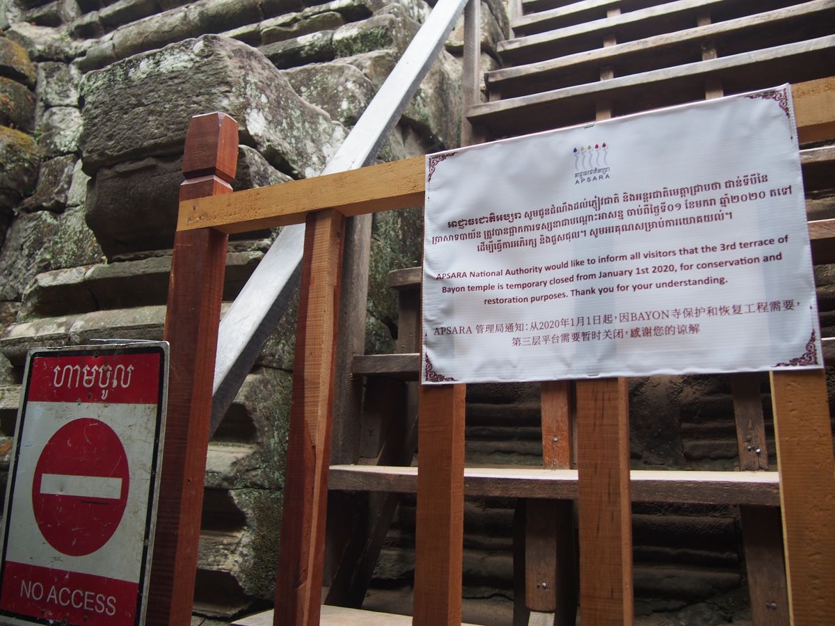 また、行程に書いてあるアンコール・トムの遺跡巡りですが、ライ王のテラスはほとんど見学できず端っこだけ見たくらい。もっと近くまで行ってじっくり彫刻を見たかった。ピミアナカスに至っては、そもそも立ち入らないので遠くから眺めたくらいでした。バイヨンの中央部は2020年1月から修復のため立ち入れなくなっているので、あの四面仏は間近で見ることはできませんでした。