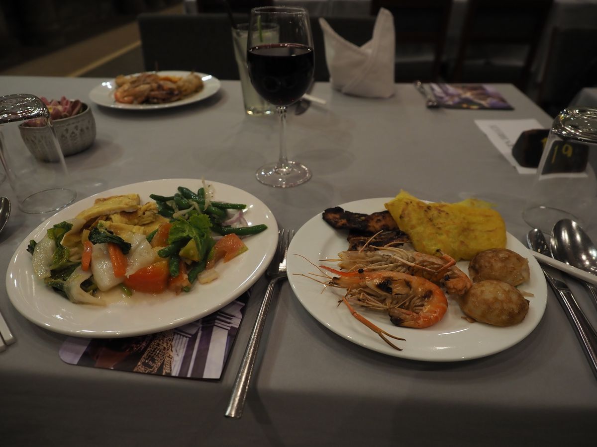 見事に外れてしまいました。半日行動したら必ず休憩をとったほうが良いとおもいます。一日中行動しますと汗が止まらずショーを見るとき下着が濡れた状態で気分よくショーを鑑賞できません。ガイドさんが気を利かして早めにアプサラダンスショー会場に到着したので目の前で調理したものを取るのに待たされることが有りませんでした。メイン料理は目の前で調理する品です。後から来たグループの方々は列を作って待つ状態でした。