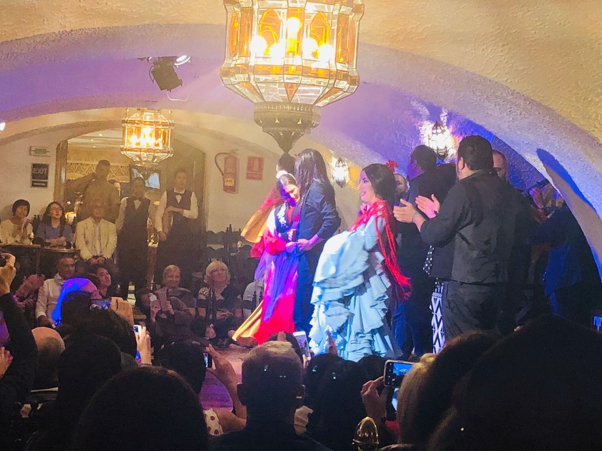 少し早めについて門番の女性から、まだ入れないから他で時間を過ごしてと言われました。時間になるとすでに長い列ができていて、予約がいっぱいなのだと感心しました。一人での参加でしたが、ショーの前の食事時間には2人掛けの席に案内されました。たくさんのタパスがあって、全種類は食べきれませんでした。お酒も飲み放題でした。ショーは椅子のあまりがないほど、満席でした。私の隣にはアメリカ人と思われる年配の女性が座っていて、小さな椅子から体がはみ出すほどです。でも、ショーは圧巻で、人間の耳が認識できる限界のステップではないかと思われるほど早いテンポでした。メンバーは雑誌で紹介されていた人たちでした。機会があれば、もう一度見てみたいです。