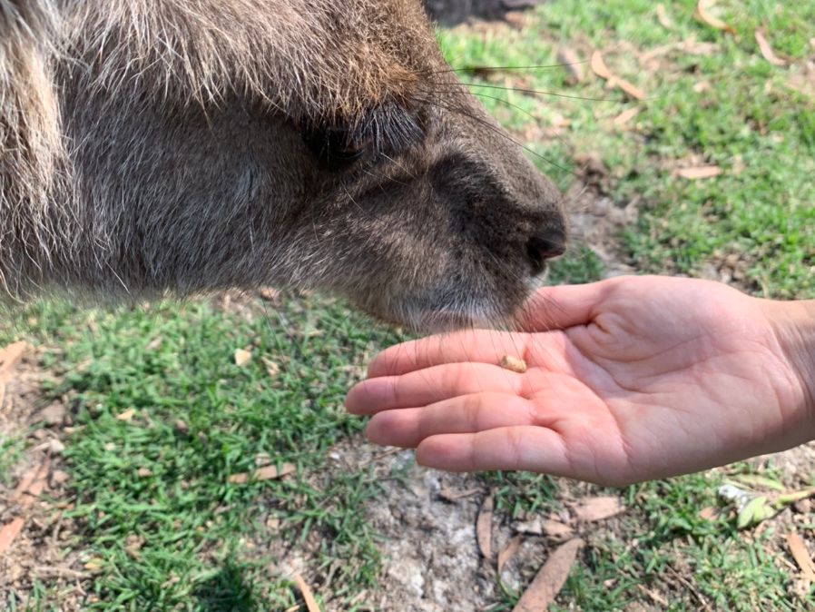 夕方以降はカンガルーたちもお腹いっぱいなのか、餌づけしてもあまり食べてくれませんでしたが(笑)、とても大人しく人間慣れしているので自然とカンガルーだらけの広場で触れ合うことができます。