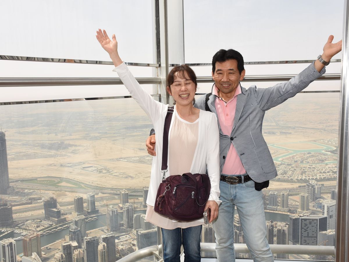 やっぱりドバイに来たからには、ブルジュハリファに登りたいと思い、お得な前売りを買いました!日曜18:30に申し込みして、少し早めに行きましたが正解でした。ドバイモールが広すぎて、入口に迷いギリギリに。やっと着いてチケット引き換えましたが、その後登るエレベーターまで大混雑でした。登ってからも、どこも混雑で降りるのも時間がかかりました。待ち時間なく登るなら、優先チケットを買うことをオススメします。また夜景も綺麗でしたが、日中の街中で見渡せる時に行きたいと思いました。