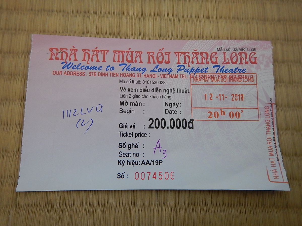 11月12日20時から開演のハノイ水上人形劇鑑賞前列確約プランにしました。10月26日に申し込みました。その日のうちに予約が確定しました。場所はタンロン水上人形劇場でした。Webページには「劇場カウンター前で待機のガイドからお渡し」と書かれていますが、以前に行かれた方の体験談と同じで、前日にホテルのフロントに届いていました。席は最前列の3番と4番でした。正面に向かって左側から1番、2番となっていて、1列に15席くらいありました。やや斜めでしたが、はっきり観ることができました。席は映画館のように段々になっていますが、できるだけ前の席の方が良いと思います。チケットは20万ドン(約1,000円)でこのプランで約2,000円ですが、チケット購入の手間が省けますし、前列確約なので、このプランはとても良いと思います。劇は短い物語がいくつもあって、劇場に日本語演目のカードもありますので、何を踊っているのかなんとなくわかりました。全体で約1時間程度です。とても良かったです。水上人形劇はおすすめですし、前列確約プランをおすすめします。