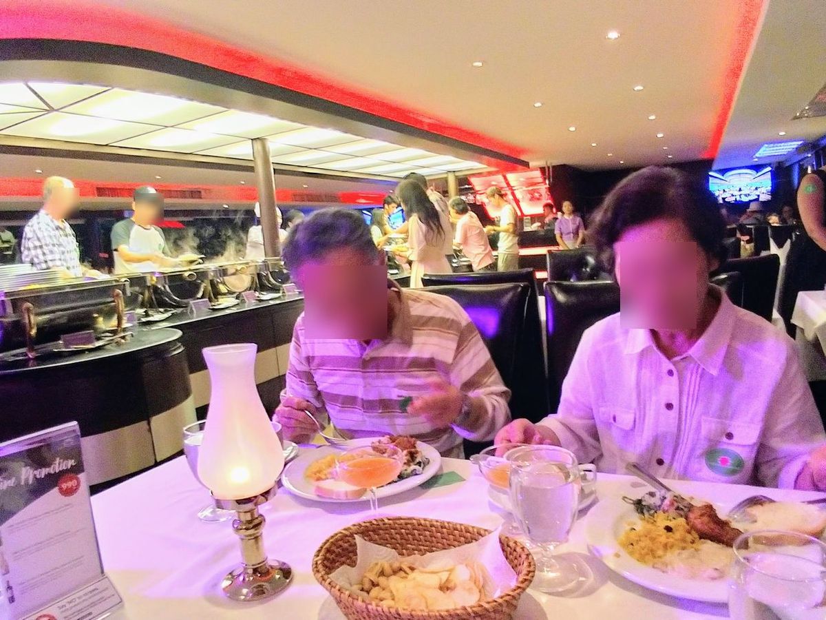 ナイトクルーズで、有名な寺院や眩いくらいの商業施設のライトアップがとても印象的でした。料理は和食も少しあり、年配の両親も料金の割には全体的に良かったと言っていました。正直なところ、食事が始まってある程度食べ落ち着くまでは夜景どころではなかった感じです・・・。時間はたっぷりありますので、食べ終わった後にデッキに出て、風にあったったりとゆっくり過ごせたのでとてもよかったです。この価格であればカジュアルに参加できるのではないでしょうか。若い方から年配の方までいろんな国の方々がたくさんでにぎわっております。また、ライブでずっと歌ってあるのも雰囲気が良かったです。