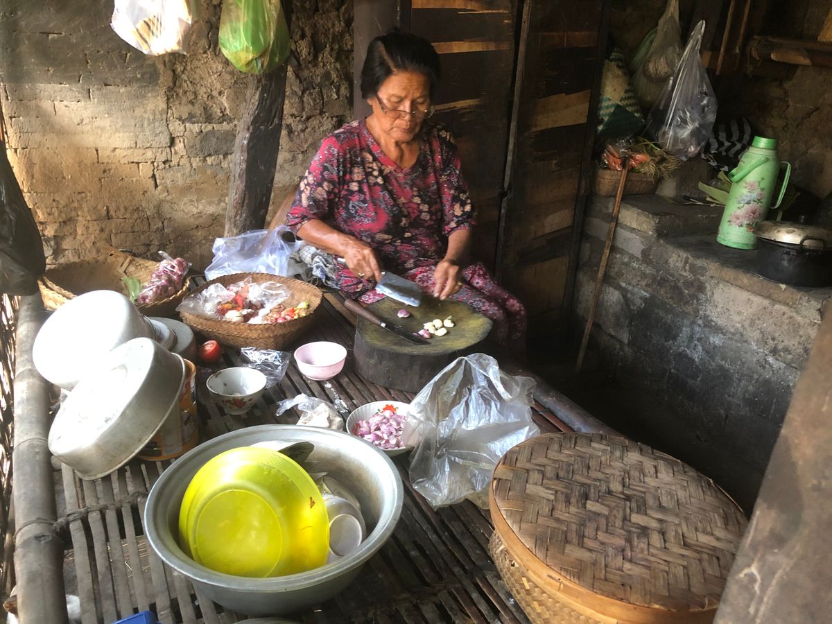 BATUAN村では、薪窯のある古い住居で食事の準備をするおばあさんや、
