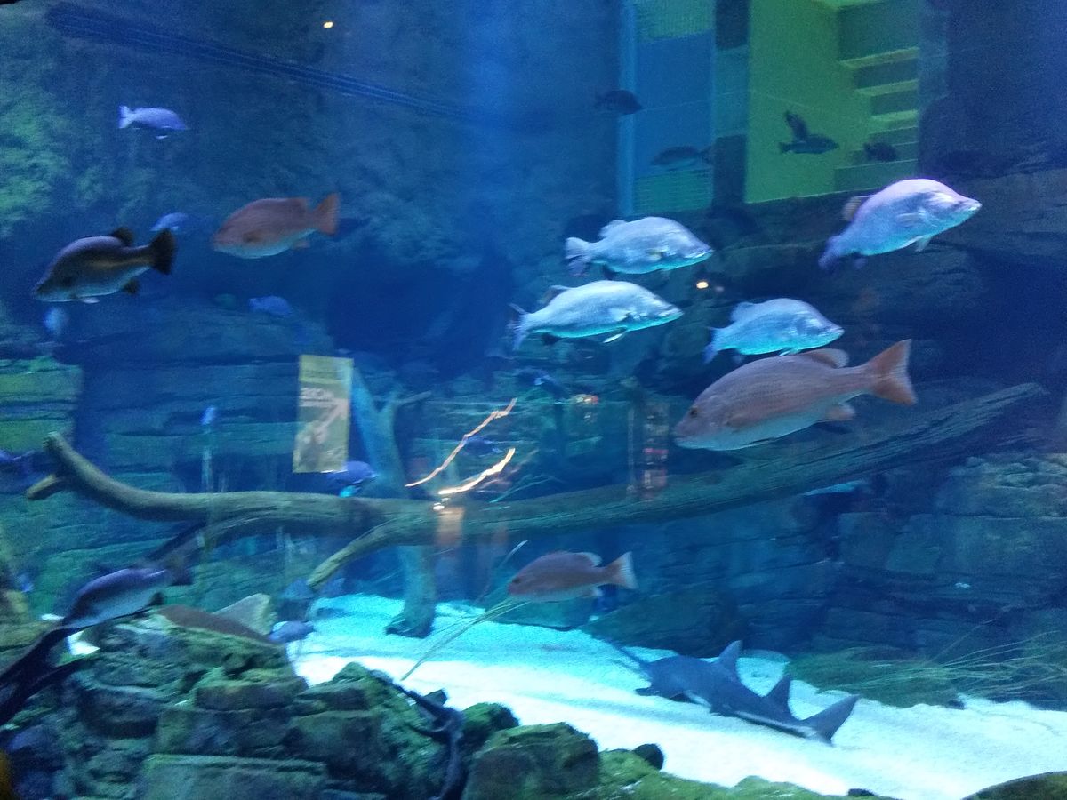 水族館の展示は淡水の魚から始まり、爬虫類やサンゴ礁の魚まで分野を分けて展示されていました。英語の掲示板の全ては読み込めませんでしたが、日本のレジャー型水族館よりも勉強や教育に力を入れている印象です。銀色の魚も多いですが、横の掲示板を簡単に読めば、なんとなく押さえるべきポイントがわかります。また、実際の海に寄せているのか、全体的に水槽の光の青が強い感じがしましした。