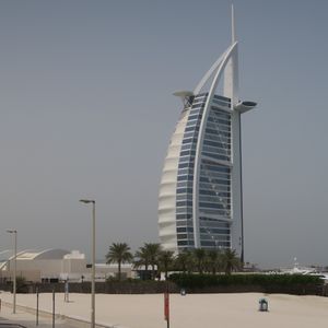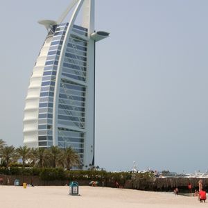 Green Lineはこのツアー3種類のうち、近代的なドバイの街の象徴を中心に巡るツアーです。(14)the Dubai Mallを出発したバスは(17)Jumeirah Mosqueなどを通り、海岸近くの通りをPalm Jumeirah方面へ。バス車内ではイヤホンにより要所要所で12カ国語での説明があり、日本語も含まれています。短かくても要領よく解りやすい説明でした。紙面による説明も同時にあれば、さらにドバイの理解につながると思います。バスはBurj Al Arab方面へ。超高級ホテルで、ヨットの帆を模した威圧感のある様相です。バスは、大通りから海岸通りへ入り、(21)Jumeirah Public Beach近くまで回り、写真撮影がしやすい位置で一時停車してくれます。