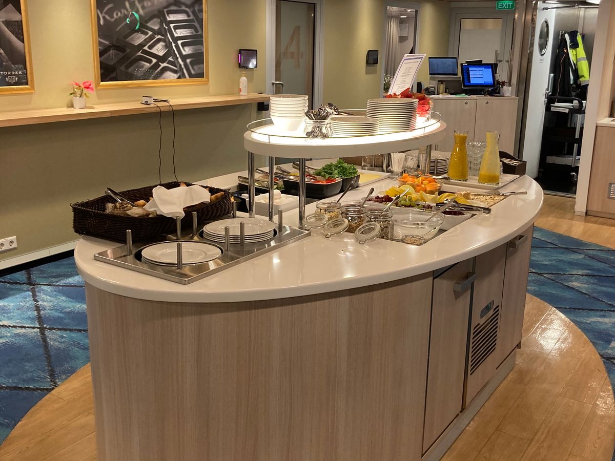 到着まで、ビールとワイン(1種類ずつ。棚に入っているものは有料)、フリードリンク、軽食がビュッフェ形式で提供されます。