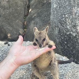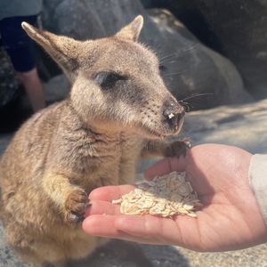 このツアーのハイライトは個人的にはワラビーかなと思います。岩場にいるワラビーたちがぴょこぴょこ来てくれてエサやりをするのですが、本当にとってもかわいい!!袋に子どものいるお母さんワラビーもいました。何匹ものワラビーさんと触れ合うことができます。