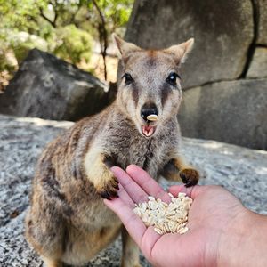 ロックワラビーのエサやりは可愛くてたまりません。爬虫類との触れ合いも貴重な体験でした。