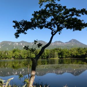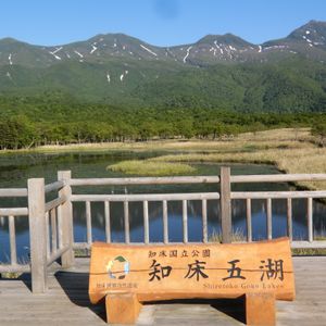 説明していただき、湖に移った知床連山をバックに写真を撮って