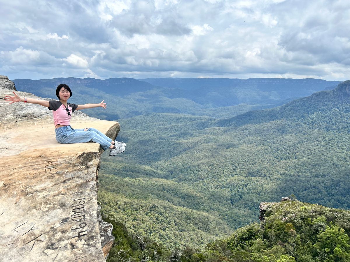 シーニックワールドの乗り物からの景色、スリーシスターズは霧で見ることができませんでした。