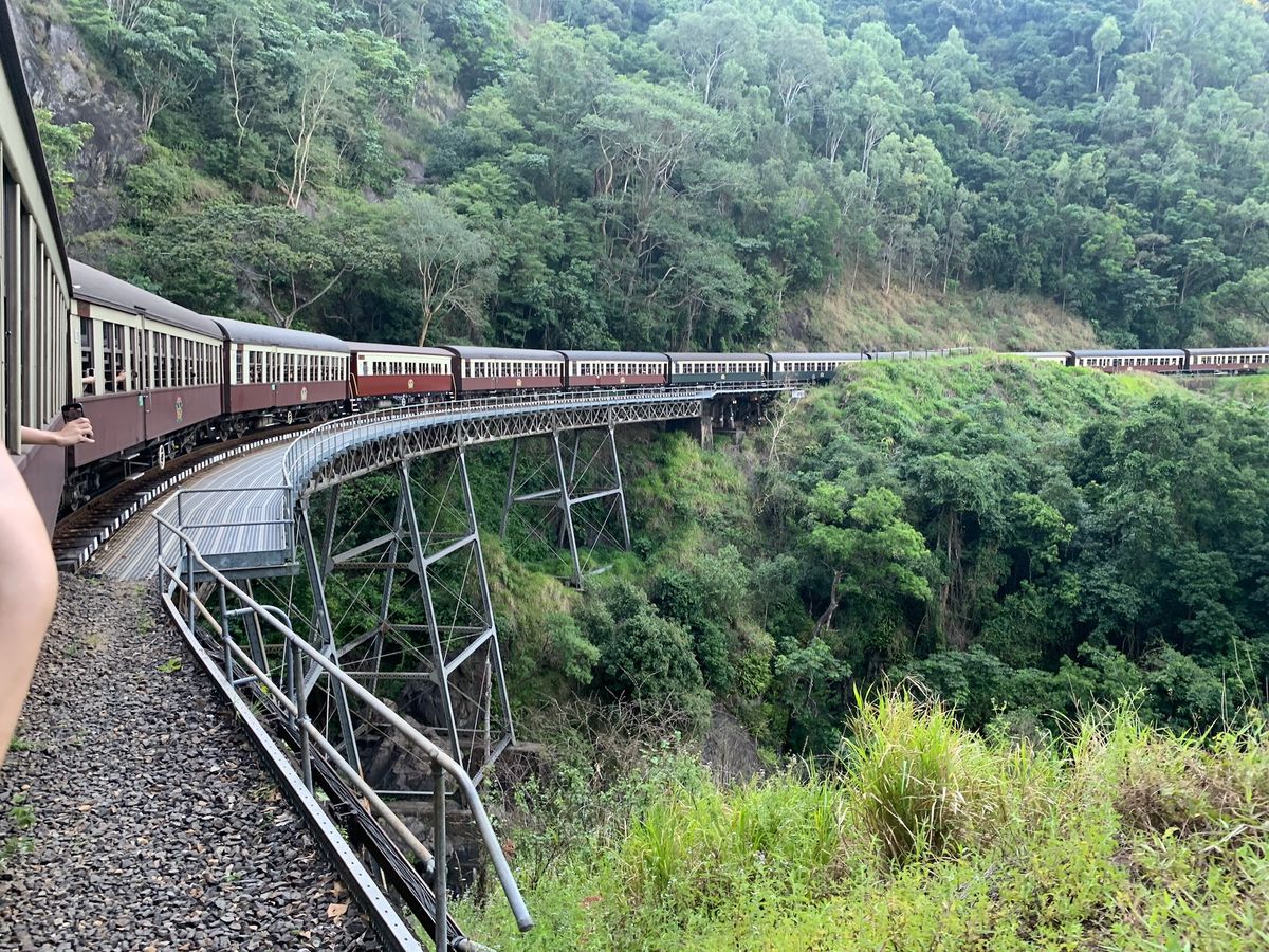 キュランダ鉄道は、レトロな列車で熱帯雨林を駆け抜け、世界の車窓からのような風景です。