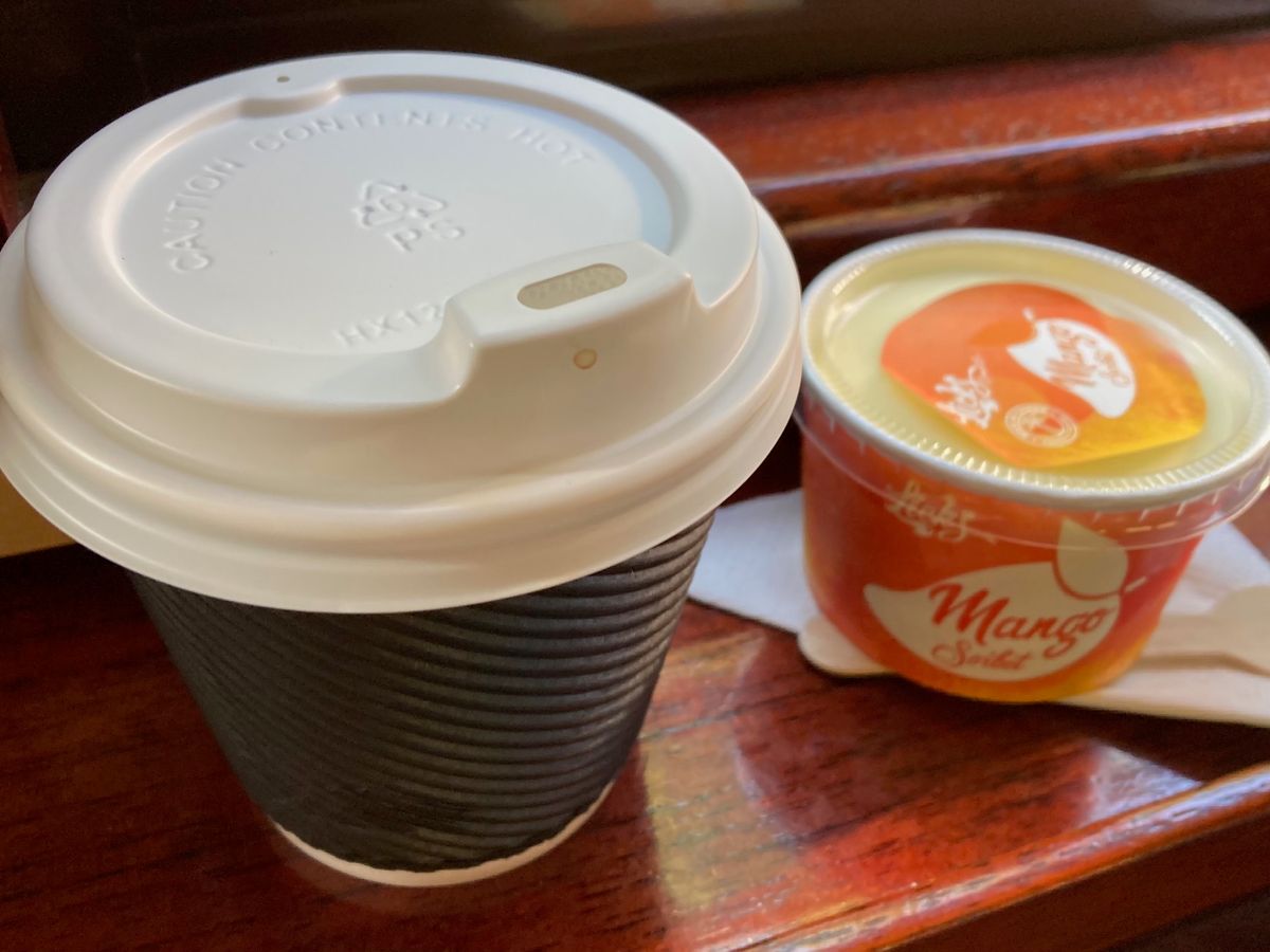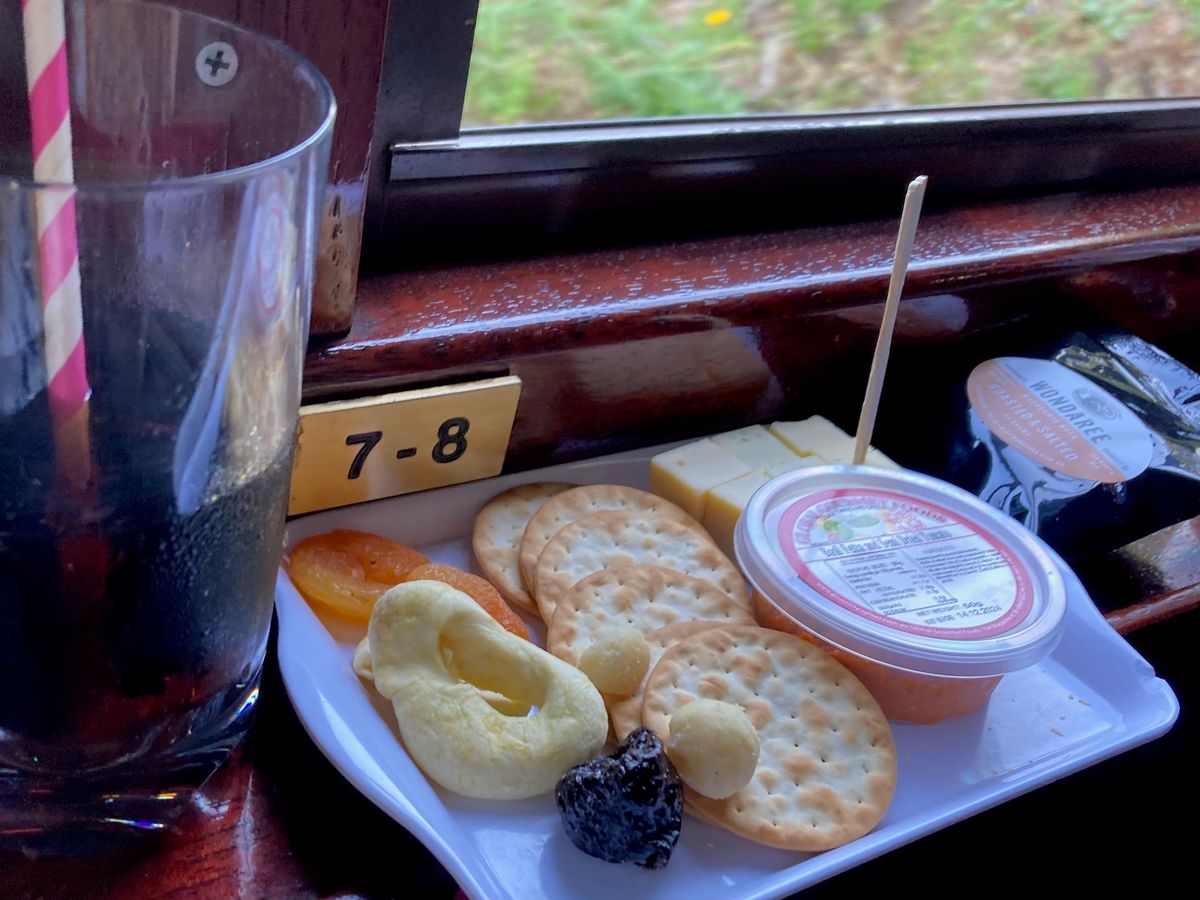 列車内では、アルコールを含む飲み物は全て無料。チーズやクラッカー、ドライフルーツにマカデミアナッツ、シャーベットまで次々と頂き、お土産のポストカードやペンまで付いて、ゴールドクラスの追加料金分は充分ペイした感じでした。