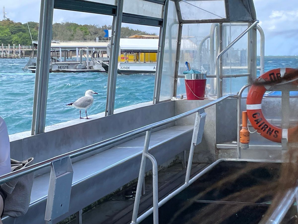 船はグリーン島まで約45分!少しやれるので、船酔いしやすい人は、酔い止めなど対策した方が良いかと思います。船の中で、無料のコーヒー、紅茶、クッキー、カウンターに酔い止めも準備してありますが、弱目の酔い止めみたいなので、強めのものが良い方は日本から持って行った方が良いかもしれません。グリーン島についたら長めの桟橋を渡って、島に上陸です!!