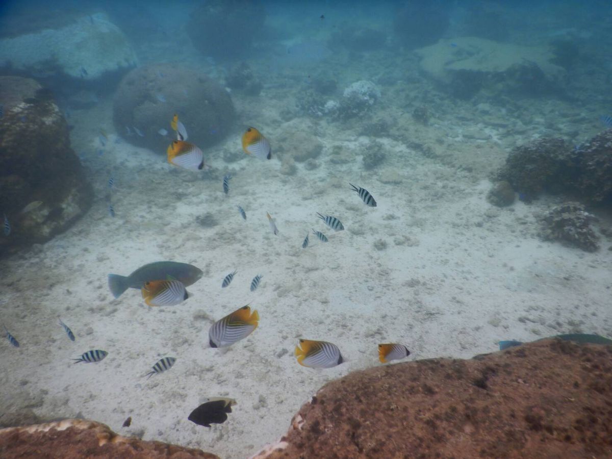 近くの岩場などに行くといろいろなお魚がたくさんいて、無料で借りられたシュノーケルセットで夢中で見学。お昼の時間も忘れそうになるほどでした。